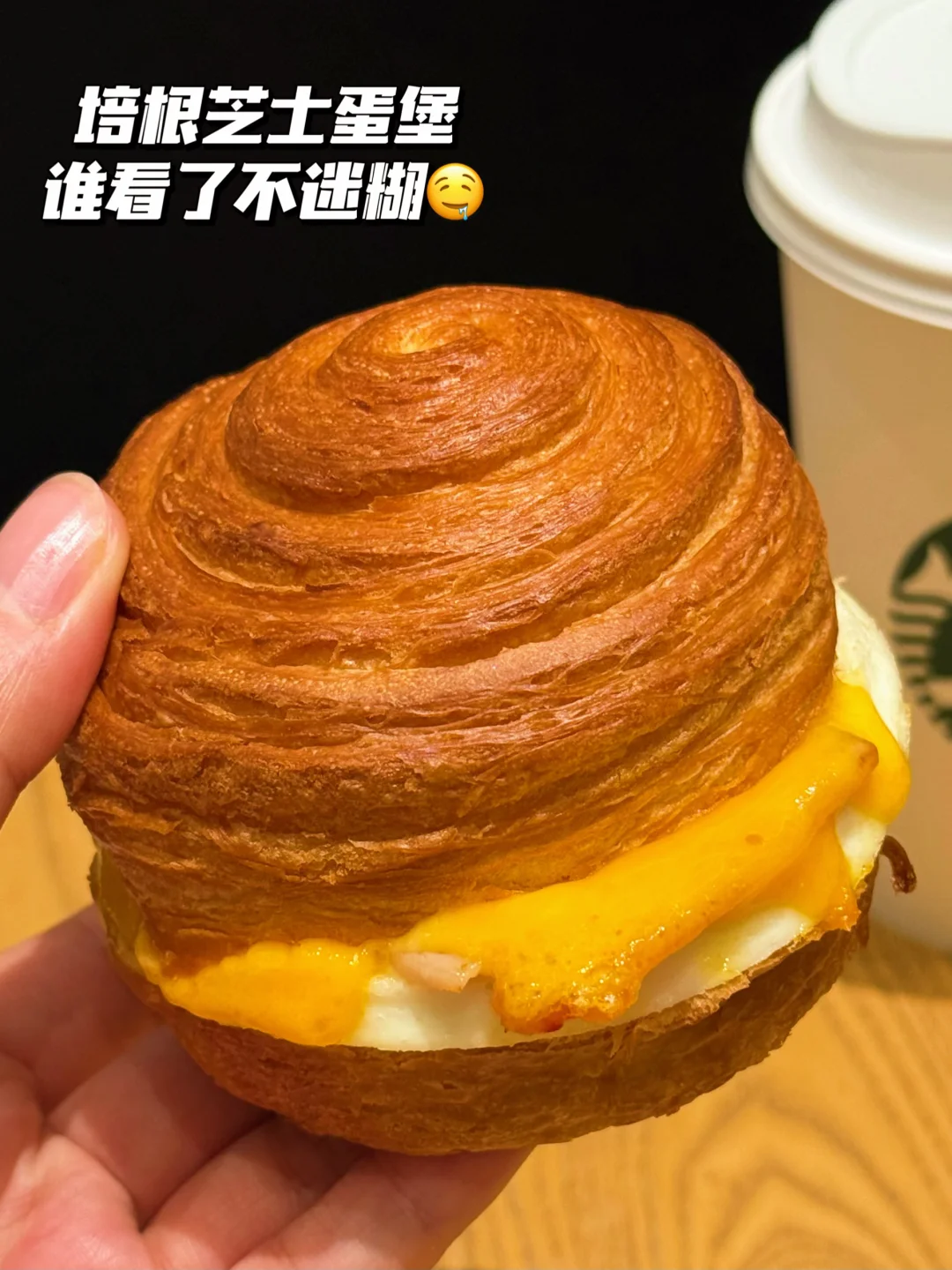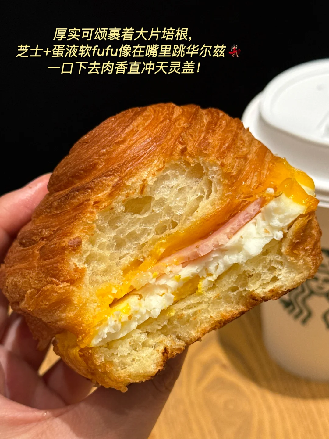 厚实可颂裹着大片培根,芝士+蛋液软fufu像在嘴里跳华尔兹💃🏻,一口下去肉香直冲天灵盖!本大胃王吃完它,中午都不带饿的,碳水+蛋白质的快乐,吃一口想喊“救命”!