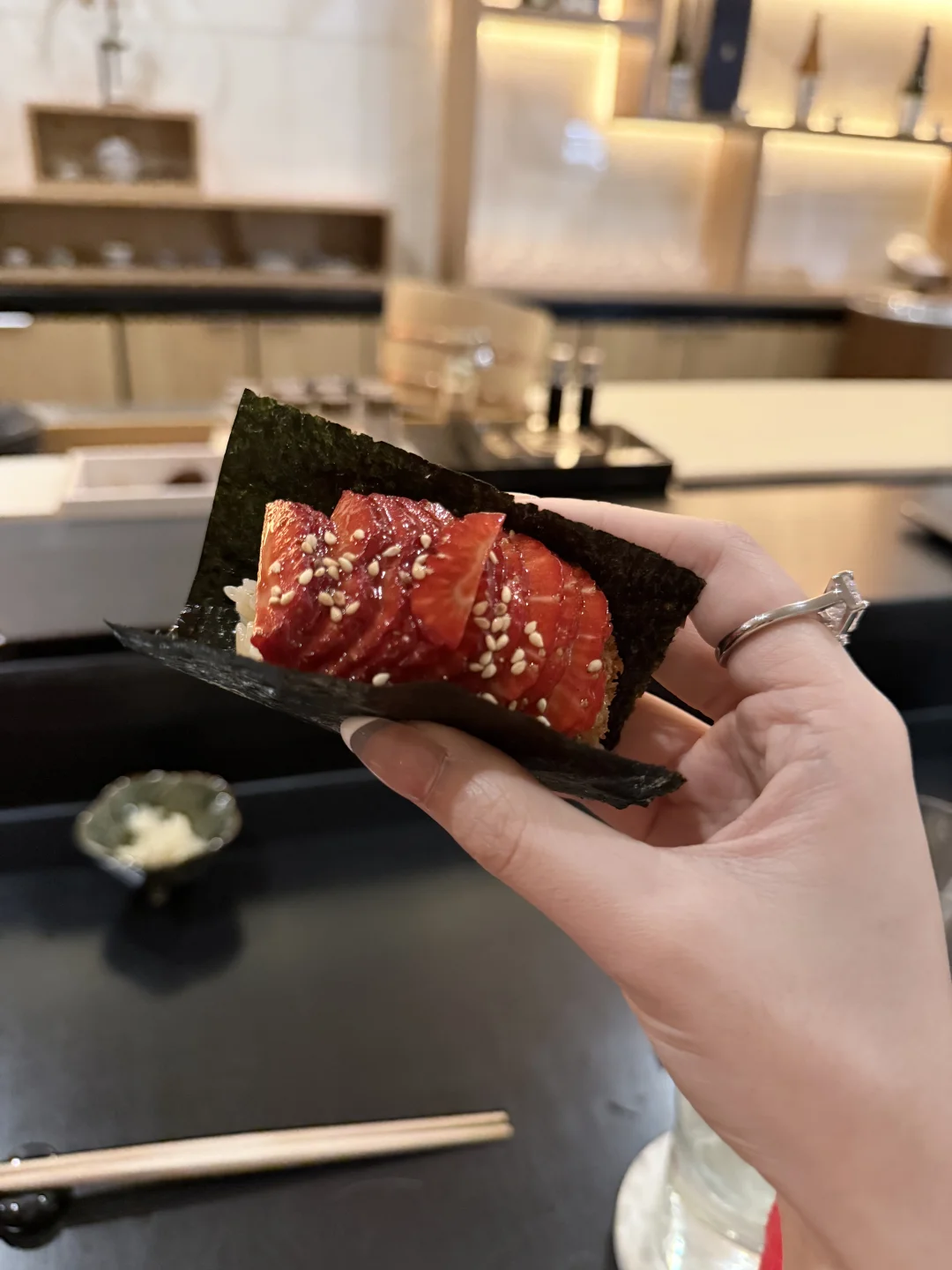刷地图偶然找到的宝藏店(其他的周末都被约满了,只有这家还有位置) 没有抱任何期待前往,但是出奇的每道都很不错 草莓鳗鱼手握很很很惊喜从没吃过的搭配 会再来的一家
