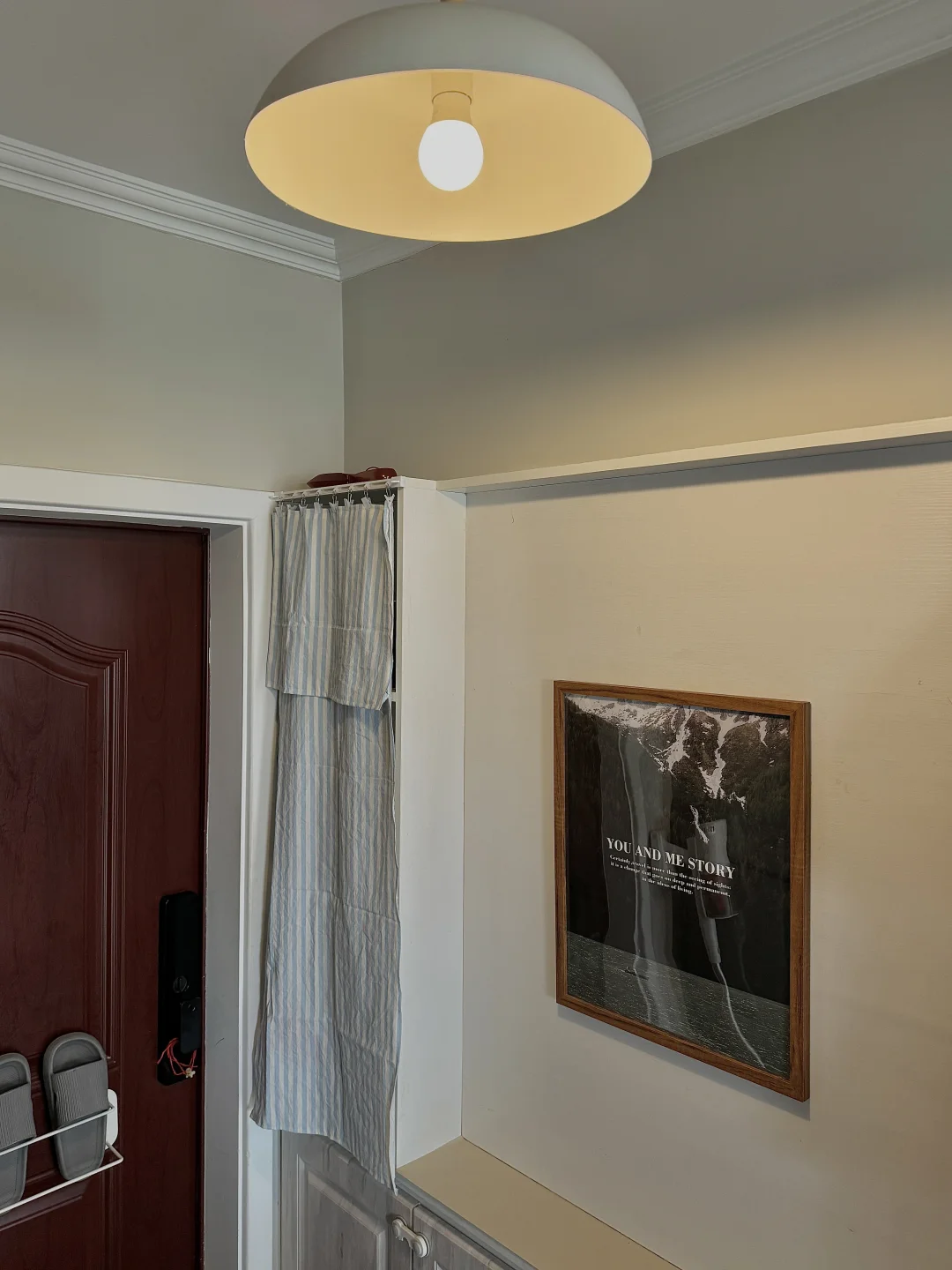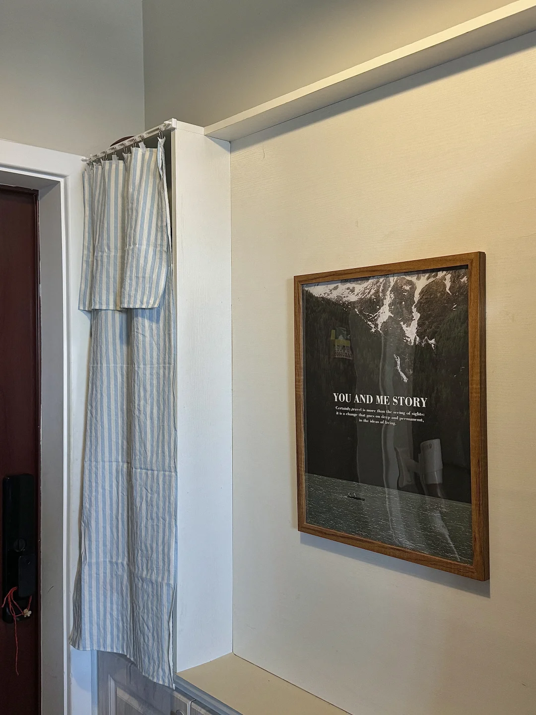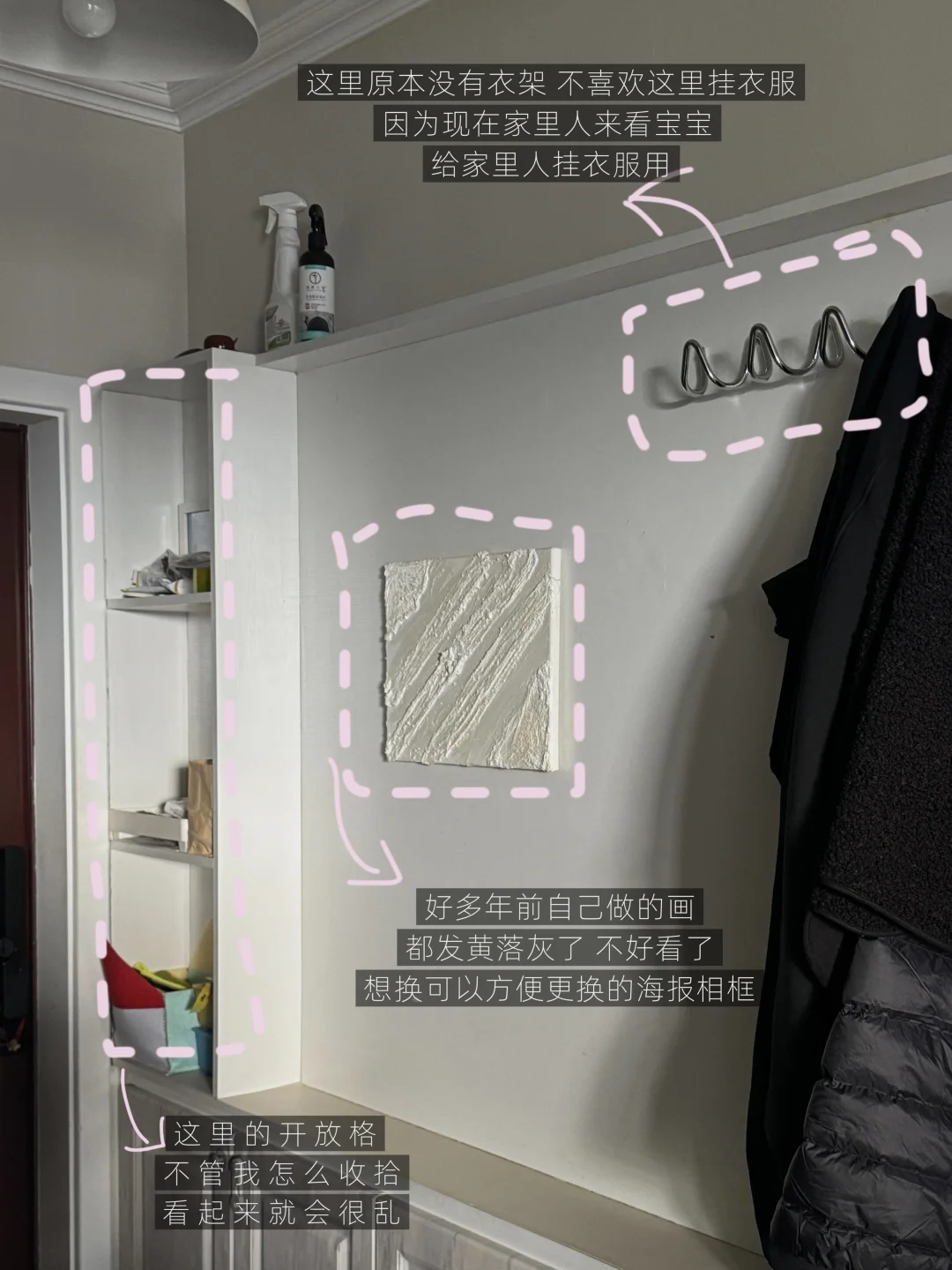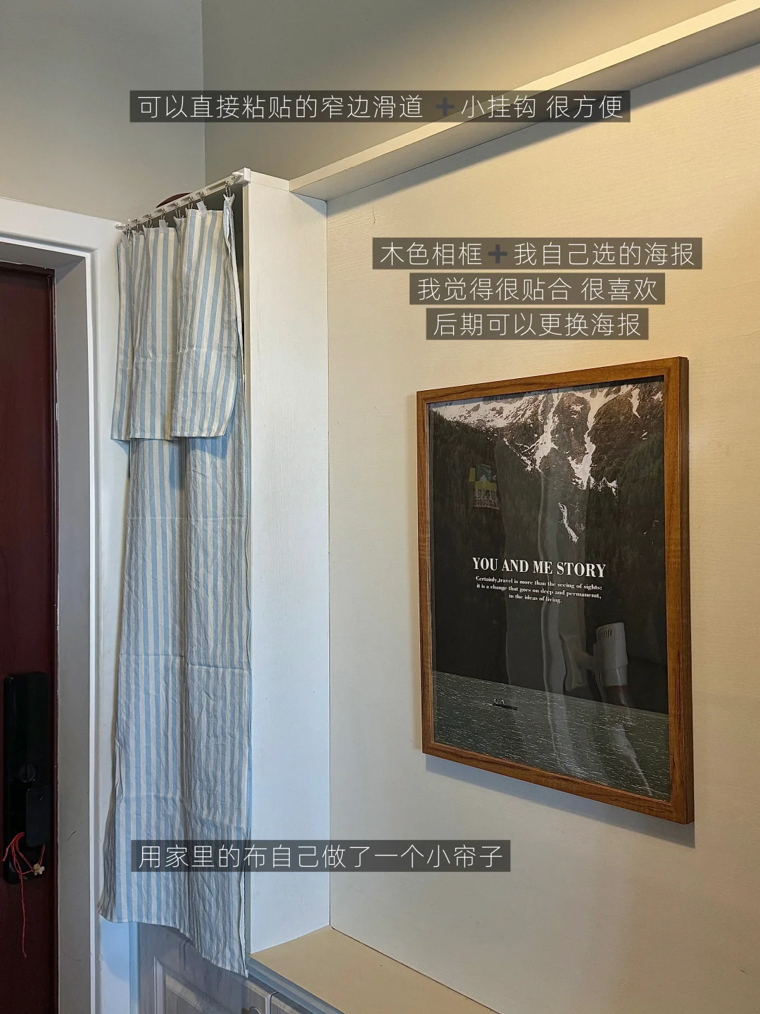 因为现在的房子以后要换,所以改造本着花小💰办大事的原则,哈哈哈,不想花太多💰。 给大家改造提供一个思路。 🧤装饰画:看了好多不便宜又不好看,用木框配自己喜欢的海报,好看!还可以随时更换,增加新鲜感感。 🧤开放格:可以加个滑道和门帘,好操作,也可以换帘子!