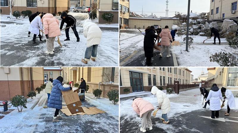 寒风凌冽,扫雪除冰现场却热火朝天。全体职工齐心协力,手持铁锹、扫帚等工具,重点清扫大院内干道、坡道、背阴面等区域积雪,并铲除路面厚冰,最后铺设废纸盒进行防滑处理,保障工作人员及住养群体的平安。