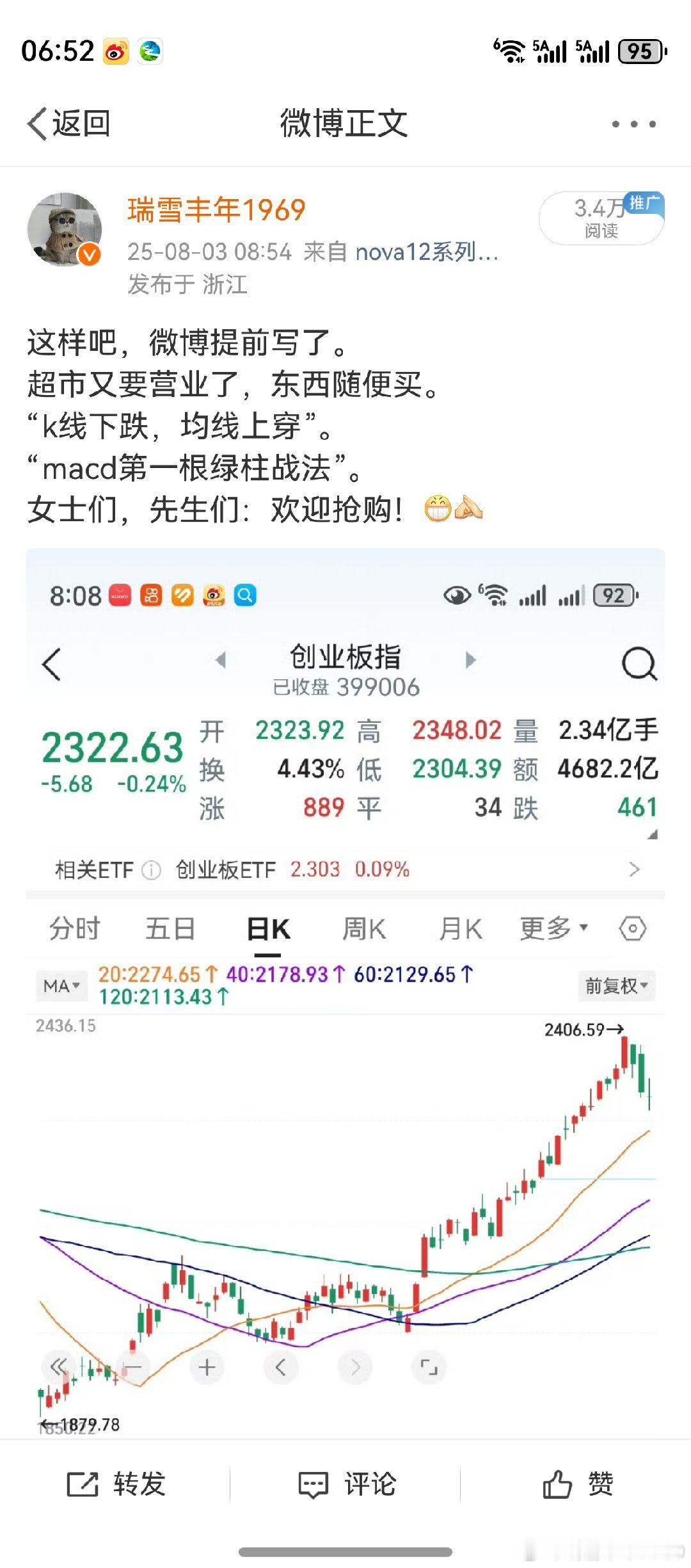 猛然间,想起了8月3日的微博内容。“k线下跌,均线上穿”,都是60上穿120。“