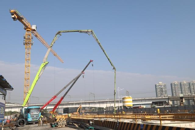 神山东站施工区域地质条件复杂,岩溶发育强烈,见洞率高达86.2%,富水砂层广布、厚度超14.4米,地下水位高,给施工带来了极大的挑战。车站为异型长大深基坑,紧邻花都区主干道广花四路以及农贸市场、厂房,东侧有已建成的综合管廊,如何确保基坑稳定性成为施工重难点。为兼顾施工质量和效率,地铁建设者们开展技术攻关,针对不同部位精准施策,确保混凝土浇筑的质量与施工效率“双达标”。