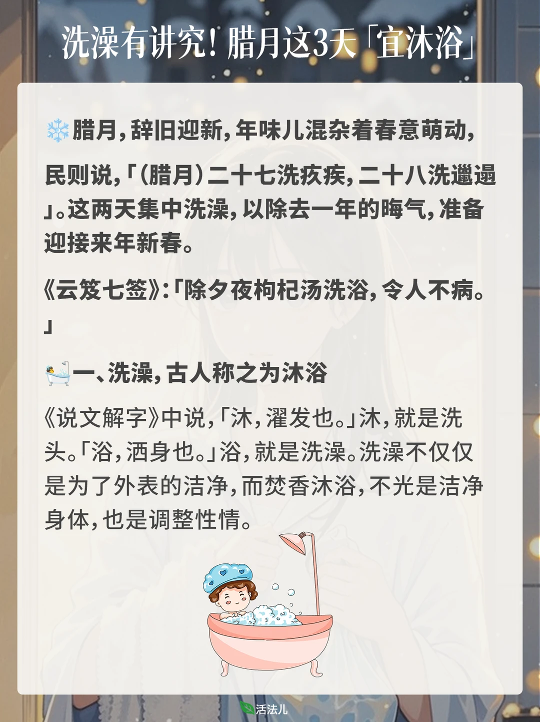 民则说,「(腊月)二十七洗疚疾,二十八洗邋遢」。这两天集中洗澡,以除去一年的晦气,准备迎接来年新春。
