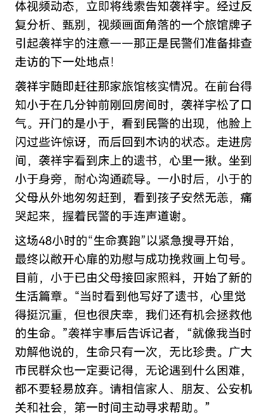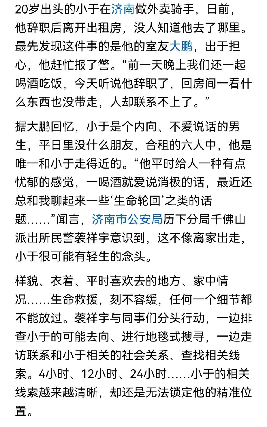济南警方好样的,没有嫌麻烦认真对待报案,结果救了外卖小伙一命,避免上海小伙自杀的结局。 事情是这样的:济南一外卖小伙辞职后失联了,没人知道他去了哪里。报案人只是他的室友,并非其亲属,也没有任何证据证明外卖小哥要自杀,也有可能心情不好跑出去散散心了。 一般来说很多地方就简单备个案了事,毕竟一天那么多报警,多一事不如少一事。但济南警方却没有嫌麻烦,而是认真对待这件事情,甚至花费了大量的时间精力走访调查。 要是外卖小伙只是不开心出去散散心,这一切不就白忙了吗?但济南警方却宁可白忙也不愿意看到小伙出事。 最终,在小伙自杀前的一刻,民警找到了他,然后开始帮小伙疏导心理,阻止了一起自杀。 这不由得让人想起前段时间一名去上海打工的19岁小伙,因此错把110元车费付成1010元,然后司机联系不上了,于是报警求助。结果上海警方声称这是民事纠纷,警方不合适介入,最后小伙自杀了。 如果当时上海警方能像济南公安那样,说不定能救回小伙一命。