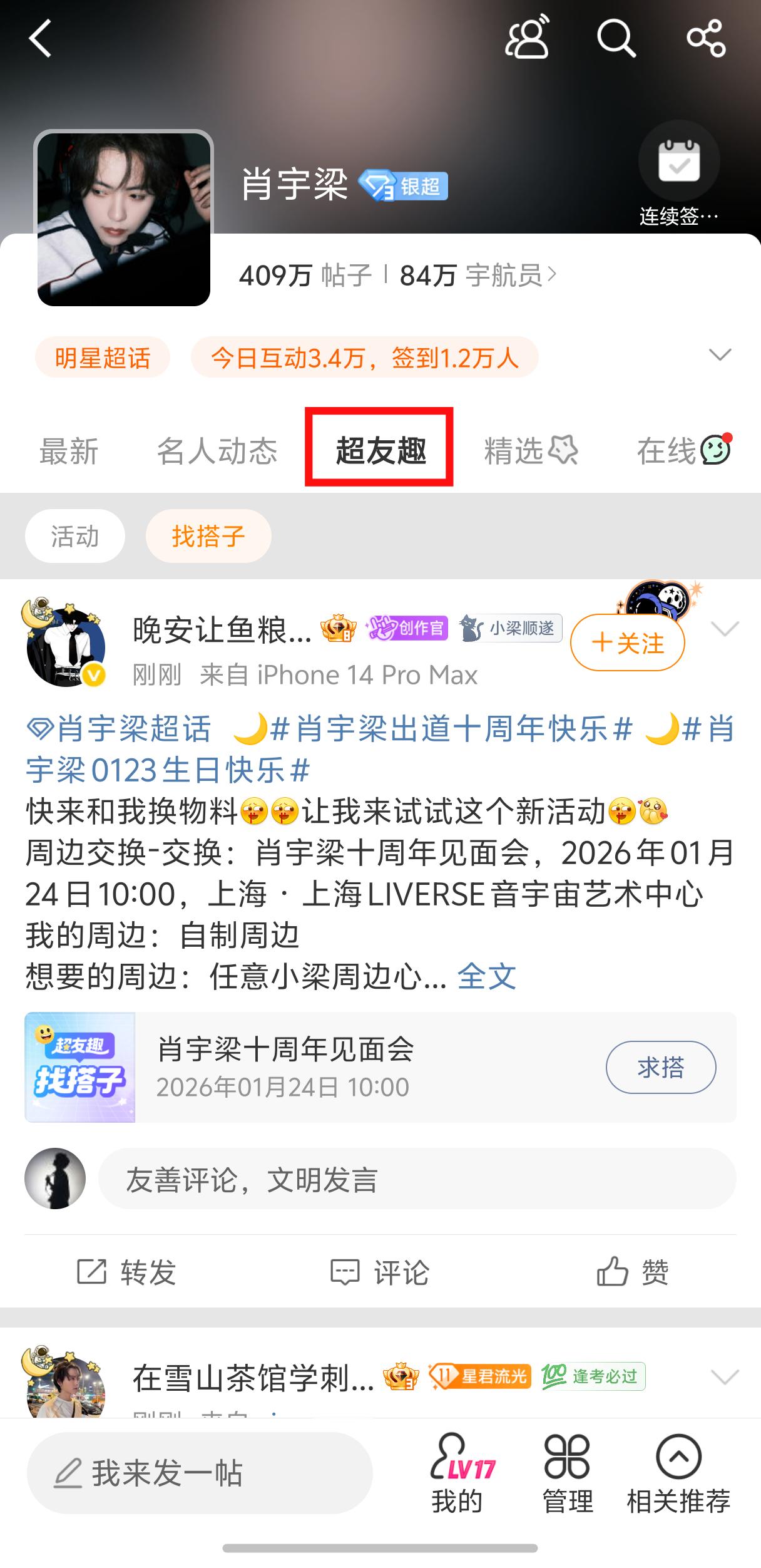 肖宇梁 超话出了一个新板块,『超友趣』主要是分享见面会的宇航员高光时刻,像发见面会当天应援打卡!也可以找搭子,比如拼房,拼车,交换物料等等,看了一下分的也很细致,真的好贴心啊!大家都参与进来哇~活动详情见网页链接肖宇梁十周年见面会 xyl肖宇梁0123生日快乐