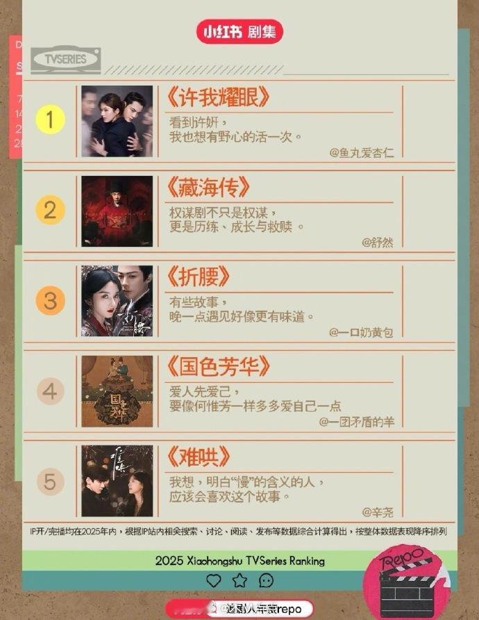 小红薯年度热门剧集TOP10,你看过几部?《许我耀眼》《藏海传》《折腰》《国色芳