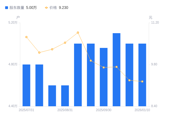 日期A股户数(户)流通A股户均持股数(股)户均持股市值(万元)2026-01-105000019691.4718.182025-11-305000019691.4718.252025-11-105100019305.3718.762025-09-304958919854.6819.262025-09-195000019691.4719.552025-09-085000019691.4721.402025-08-314600021403.7822.542025-08-104600021403.7822.072025-08-074800020511.9520.922025-07-314800020511.9521.99
