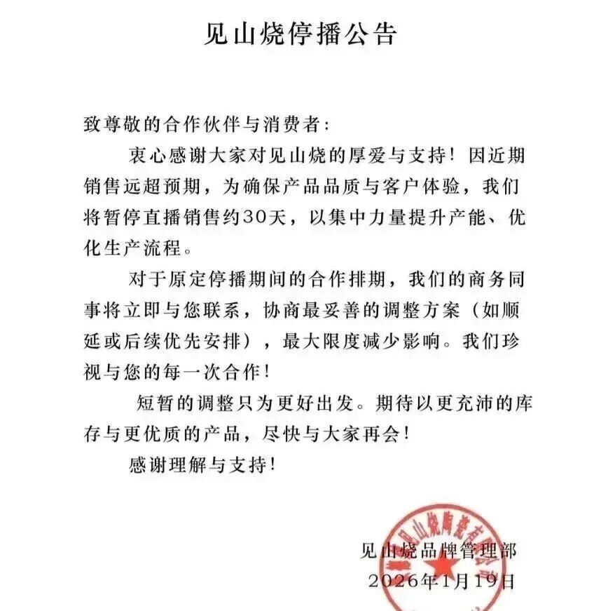 1月19日,李亚鹏带货的茶具品牌“见山烧”发布公告,表示因近期销售远超预期,为确保产品品质与客户体验,将暂停直播销售约30天,以集中力量提升产能、优化生产流程。
