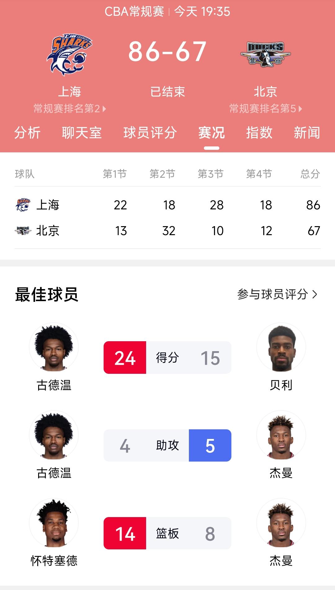 实际上北京男篮阵容实力并不逊色于上海男篮,为何最近几场比赛北京男篮的的的状态如此低迷呢? 相比于赛季初北京男篮连战连捷,最近几场比赛赵睿没有出战,陈英俊也没有之前得分那么高,周琦看起来缺少激情,整个球队看起来缺少凝聚力。 相比之下上海男篮现在调整的很不错,大胜北京北汽、广东宏远、浙江广厦足以说明其实力之强。如果能持续保持这样的状态,我感觉上海男篮第2座CBA联赛总冠军真的是指日可待。