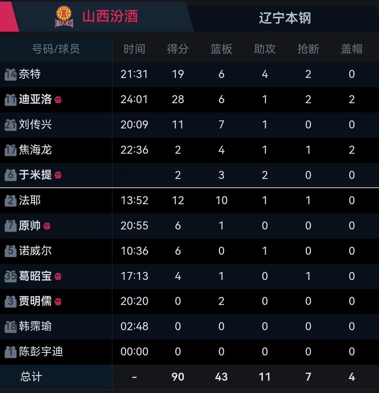 山西汾酒男篮90:86辽宁。 迪亚洛打出赛季以来最佳表现,本场绝对功臣。 就是这