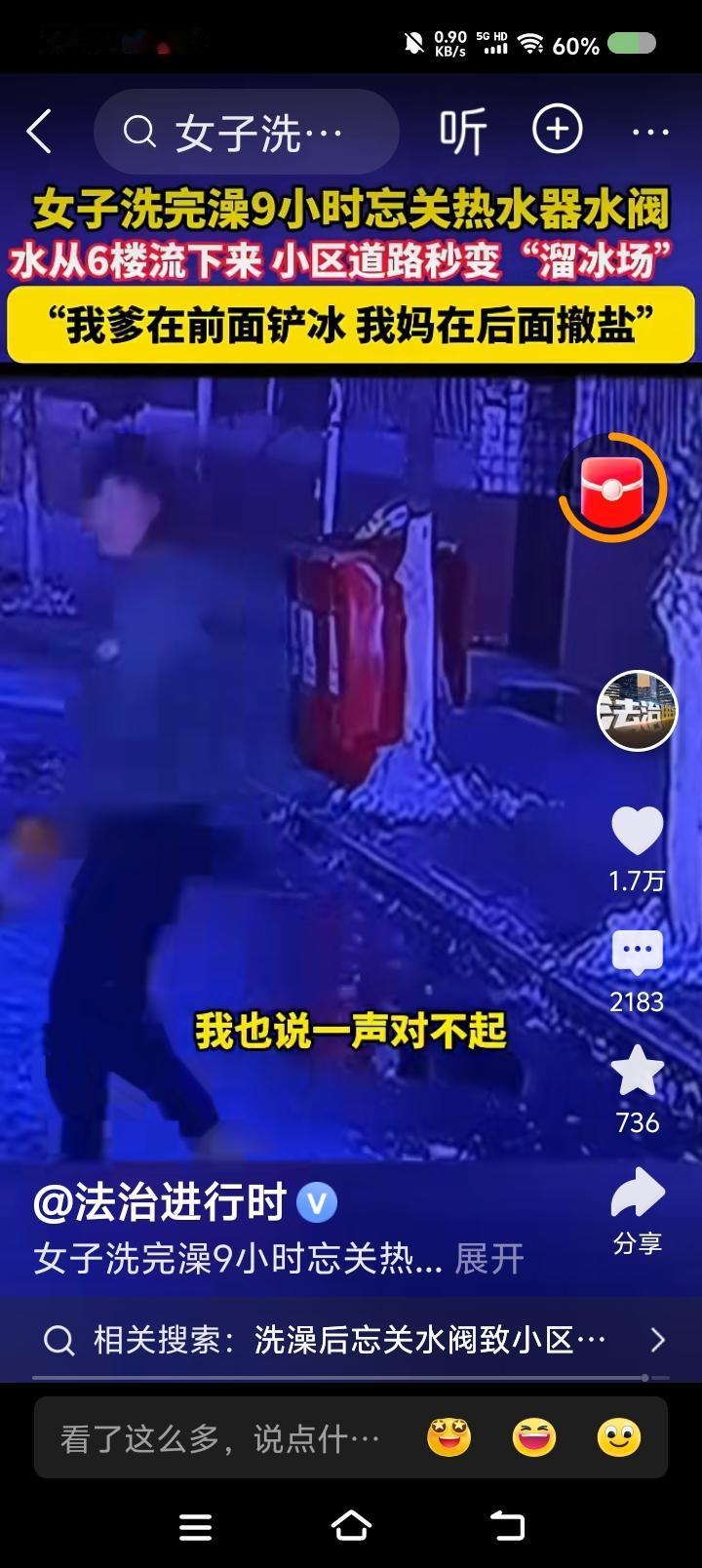 看不懂这则新闻!—— 据报道,一女子洗完澡,忘关热水器水阀,9小时。水从6楼流下,小区道路秒变“溜冰场”。女子已道歉。 点评: 水走这家的大门,下楼梯,过楼道门,进入小区道路?是么? 那整个楼道的人不会打电话给物业吗?