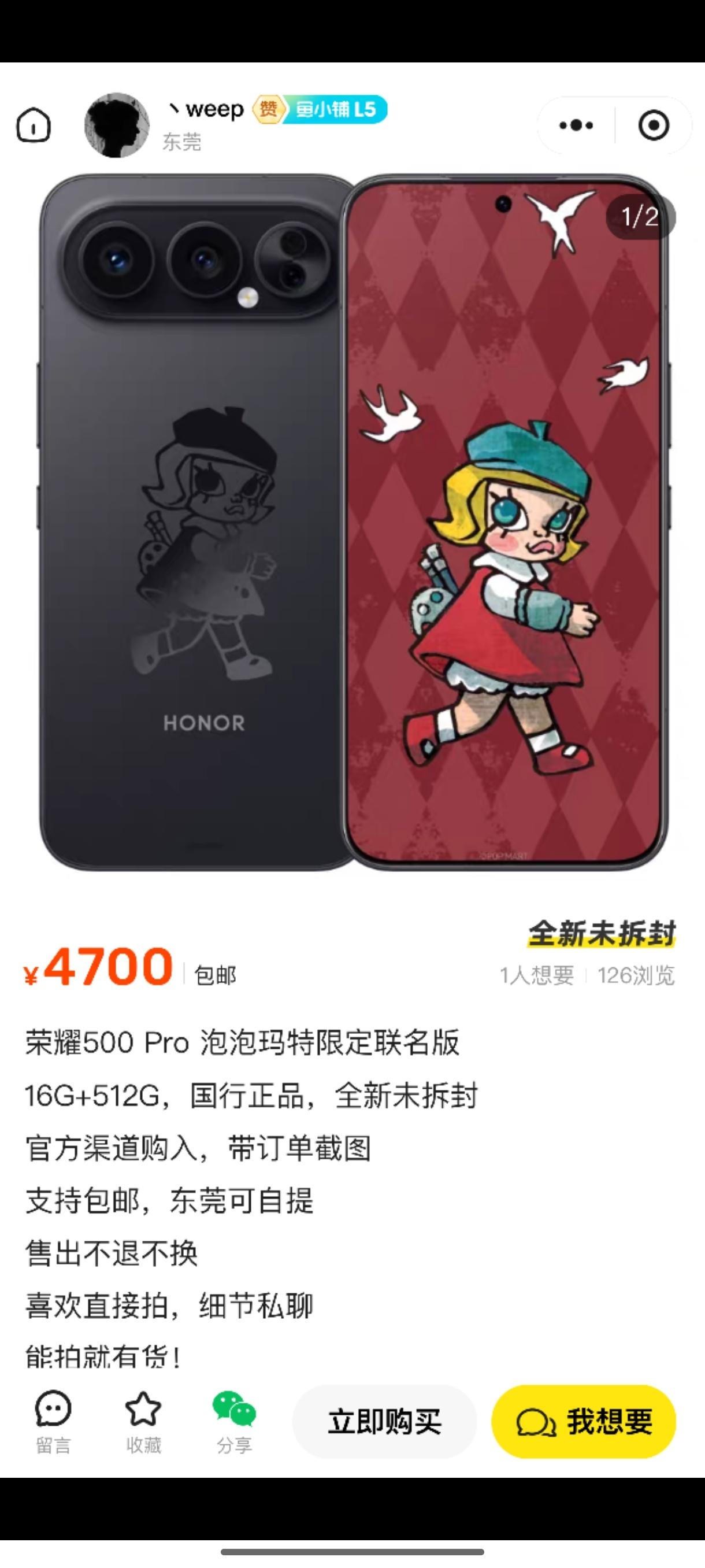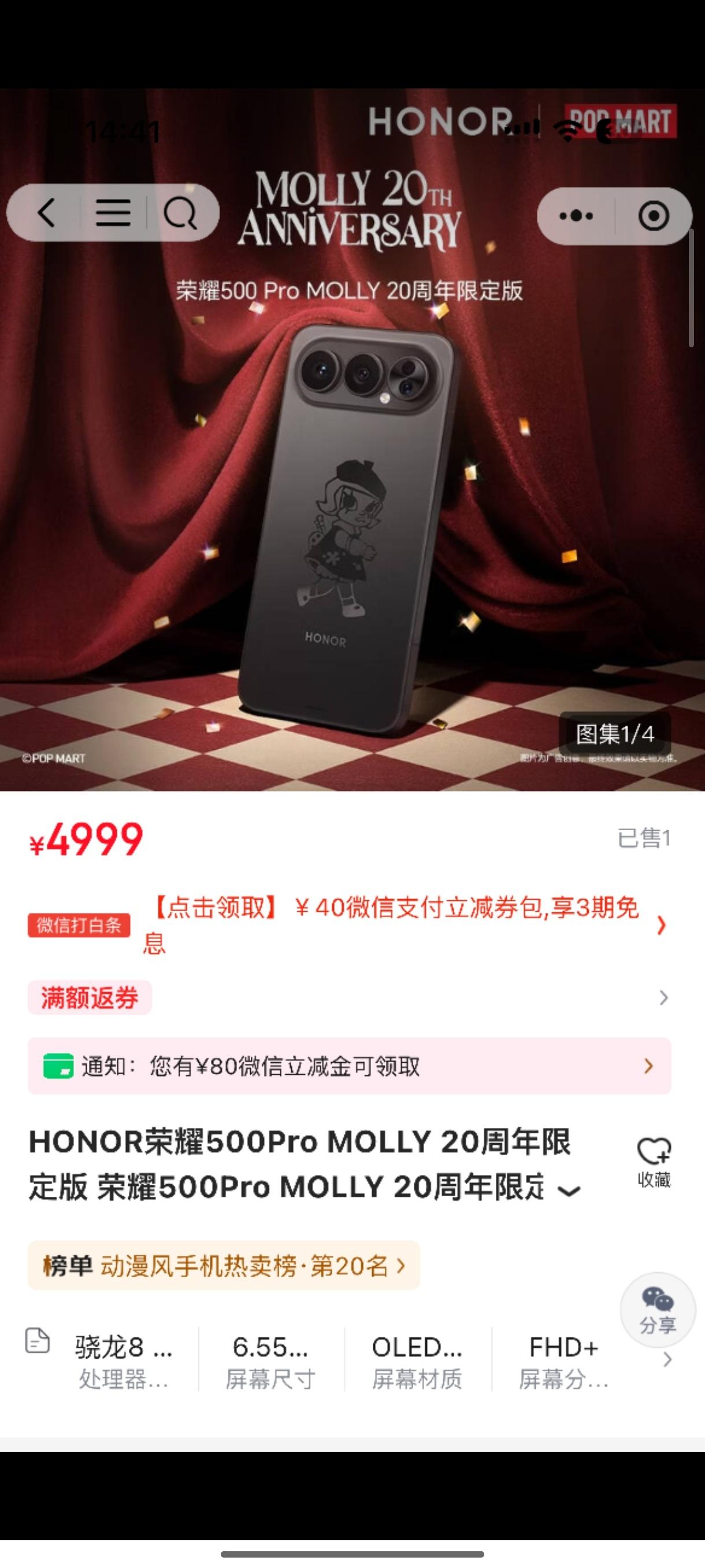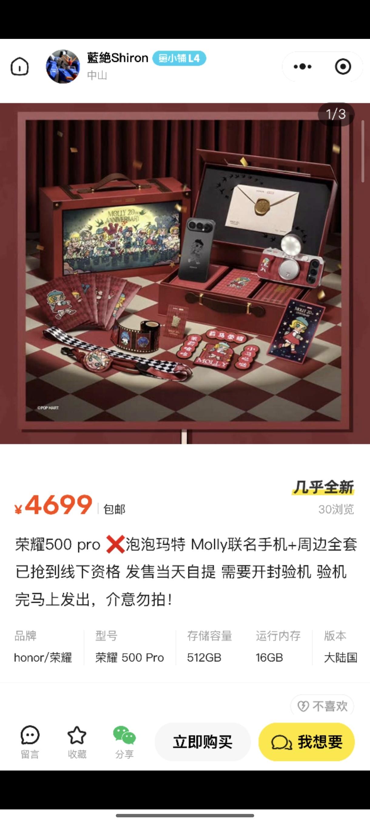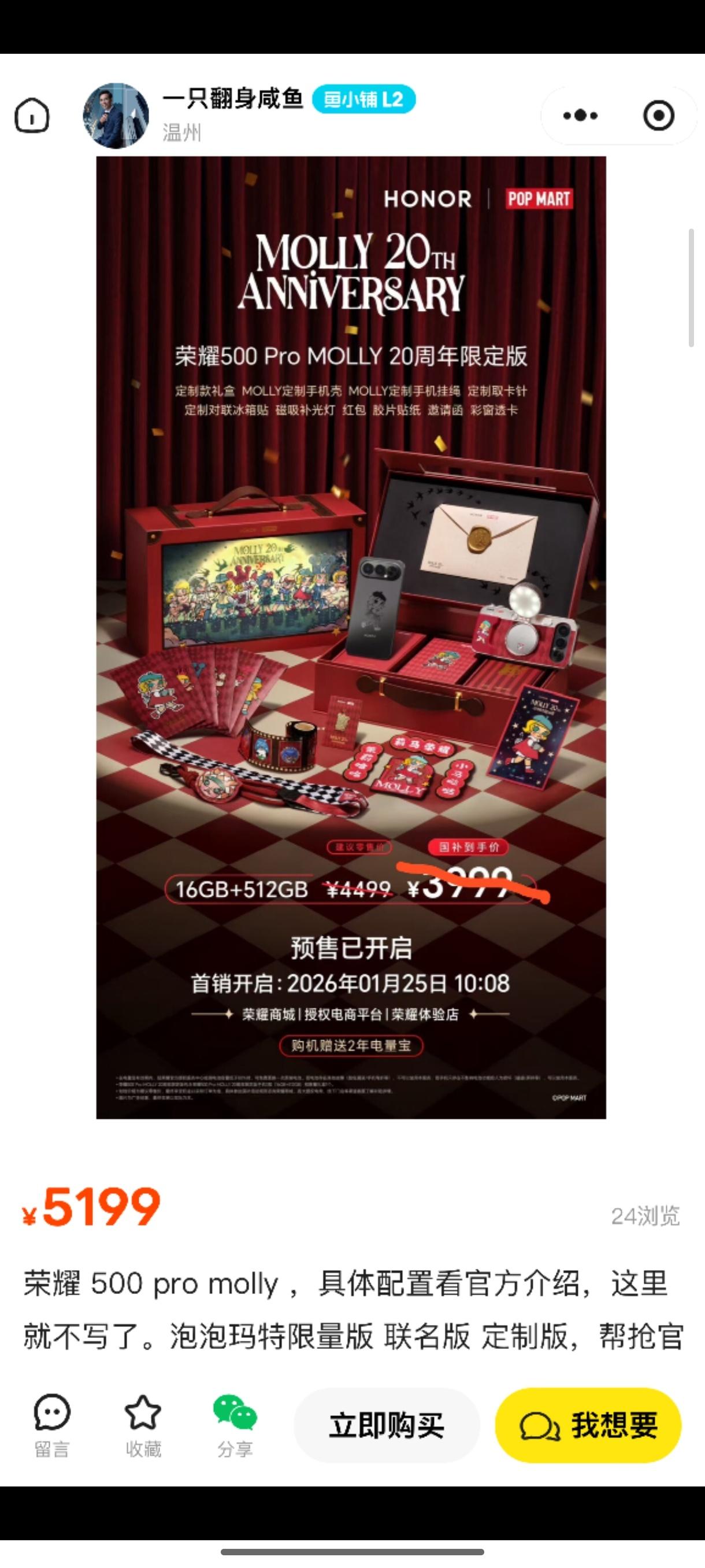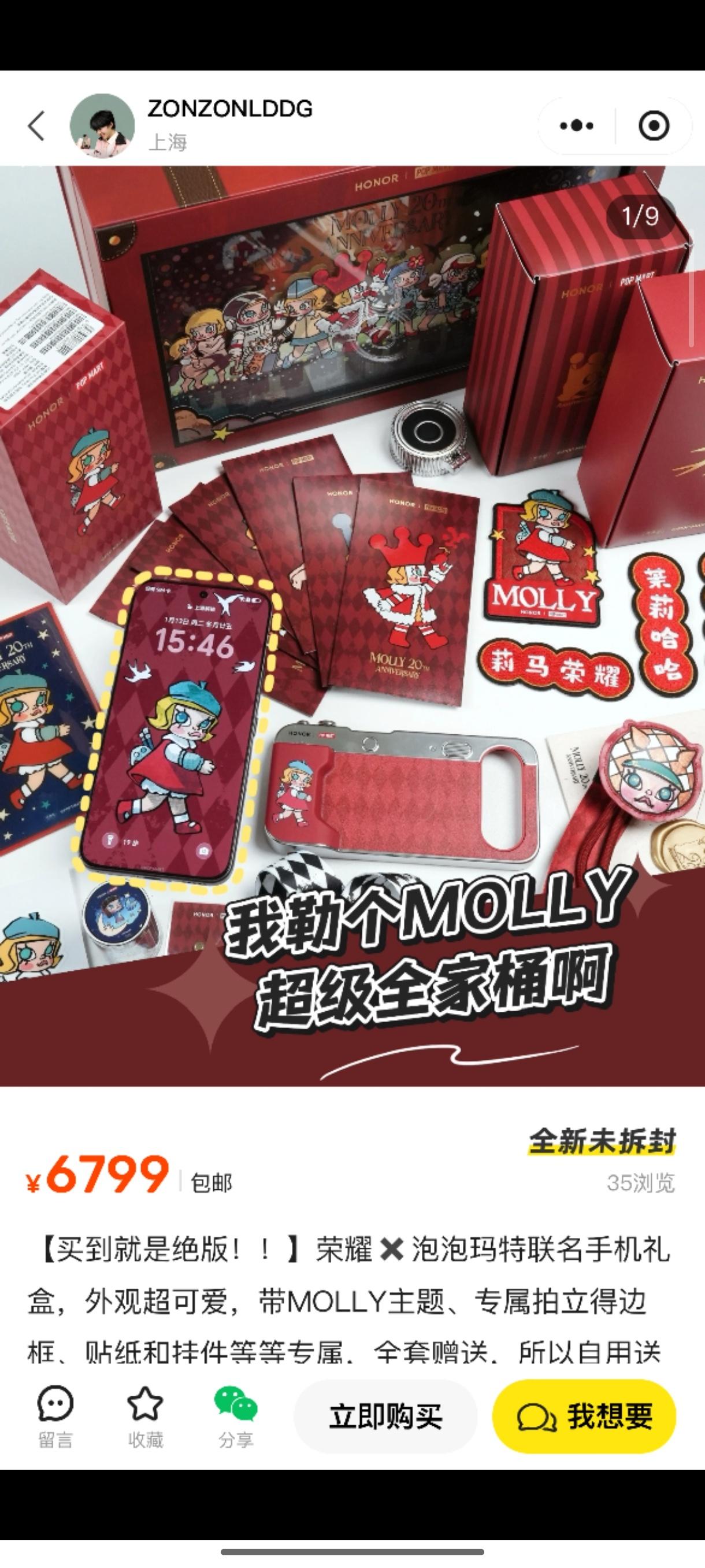 抽奖,礼品为荣制运动保温杯1个。关注转发。 每一代年轻人都有特定喜欢的礼物。昨晚荣耀发布会推出的荣耀500 Pro MOLLY 20周年限定版,引发网友在社交平台上晒出预定订单,同时二手平台也出现了黄牛党倒卖现象。 作为2026年度现象级联名产品,这款融合荣耀前沿科技与MOLLY经典灵魂的收藏级单品,无论是出于收藏还是倒卖目的的朋友,都要记得抢先预定,因为这限定版随时会停止销售。抽奖详情