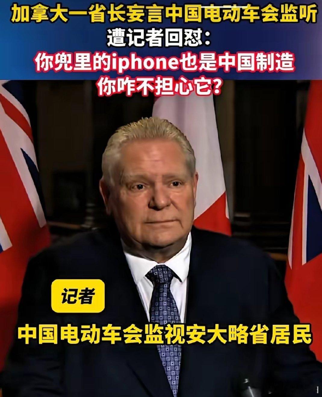 加拿大安大略省省长抛出荒谬言论,无端指责中国电动汽车存在“监听风险”,此番缺乏依据的妄言当即遭到记者犀利回怼,引发舆论关注。记者首先直面质疑,向该省长追问:“你有何具体证据能证明中国电动汽车会监听安大略省民众,或是窃取他们的通话信息?”面对核心证据的追问,该省长并未给出任何实质性回应,反而继续渲染不实论调:“对国家安全构成最大威胁的正是中国。我们很清楚,当你接通电话时,他们就会实施监听,事情就是这么简单——不相信这一点的人,实在太过天真。”这番站不住脚的表态瞬间被记者抓住逻辑漏洞,当即反诘:“若按你这套逻辑推演,你是否也会担忧自己口袋里那部中国制造的手机?要知道,你的iPhone同样产自中国。”一句话直指其言论的双重标准与荒谬本质,让对方无从辩驳。