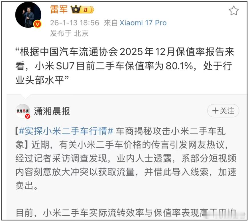 小米又出幺蛾子!对小米来说,2026的开年还真是诸事不利。如果不是西贝,恐怕就属它的热度最高,一个热搜接一个热搜,新车上完、又上二手车,前几天各大平台一搜就能发现许多号在唱衰小米二手车,标题起的一个比一个狠,像“小米二手车大跳水”、“小米二手车开始血崩”......除了文的,还有攒劲的视频节目,就如下图,说是有车商因为行情太差、二手车砸手里了,上演下跪卖车、哭穷卖车、做法卖车等各种吸睛节目。见过跪先人的,跪车的我真是头一次见,真的是,在互联网上除了外星人没见过,什么奇奇怪怪的都见过了。有句成语叫三人成虎,这一幕只要多刷到几次,别说普通观众,哪怕是行业老司机也得怀疑小米二手车是不是真的卖不动了。没想到的是,13号下午五点多潇湘晨报发了个微博,标题叫做“‘实探小米二手车行情’,车商揭秘攻击小米二手车乱象”。潇湘晨报说,小米二手车实际流转效率与保值率高于平均水平,与网传乱象描述存在明显偏差;另外根据中汽协25年12月保值率报告,小米SU7目前的二手保值率为80.1%,处于行业头部水平。很快,晚上小米的高管以及雷军都转发了这个微博。这事孤立看起来不大,但略微想一下却发现,自打2026开年,小米几乎在自证循环当中越陷越深,风吹草动都能把它送上热搜。开年刚刚十来天,小米的热搜感觉好像都没怎么下来过。先是年前预告跨年拆车直播,后面说因为感冒推迟到1月3号,到了1月3号那天,雷军直播拆车+回应此前的一系列争议和所谓“谣言”,姿态很明确:别让黑子、水军和黑公关的负面言论定义小米汽车。在那场回应中雷军和公关总徐洁云几乎回应了绝大部分网上常见的争议,包括“大字宣传、小字免责”,“1300公里只充一次电”,“200公里瞬间刹停”,“小米有7000法务”,等等。雷军这次回应可以说是做足了准备,但看看相关视频、热搜下面的留言,可以说是好坏参半,有的网友对一些回应表示理解,有的则产生更多质疑。接着更难堪的是,直播回应的热乎劲还没过,小米又因“签约‘米黑头子’”上了热搜。事情源于一个叫“万能的大熊”的KOL(关键意见领袖),此人之前长期以“反米先锋”形象出镜,在某博上有200多万粉丝,吸引的粉丝也都是以“反米”为基本立场,万能的大熊则被人称“米黑头子”。这哥们不但攻击小米还侮辱米粉,例如“小米不会死,死的是米粉”、“米粉是负资产”......长期夹枪带棒攻击小米及粉丝,粉丝群体也长期对立。换句话说,米粉对其可谓是恨之已久,且恨之甚深。但米粉们万万没想到,大熊在一个群里嚣张招摇,把小米投了他的消息扔了出去,这东西就像一记闷雷,把米粉轰的外焦里嫩。米粉瞬间炸锅,要知道从小米汽车到小米手表、空调、打印机等等产品,大量首批下单用户都是黏性十足的铁杆米粉,出于对创始人个人IP的信任与支持,在没有市场验证的情况下无脑下单。可“招安”米黑头子的这个操作就相当于,两军正在对垒、己方追随者摩拳擦掌准备同仇敌忾的时候,领头的却私下搞起了和谈。这等于直接背刺了己方深信不疑的追随者,这让追随者怎能不愤怒?有用户甚至直言“投‘米黑’就是背叛千万米粉!”因此消息曝出后,愤怒的米粉瞬间冲到了雷军等小米高管的评论区里,激烈地表达不满。核心用户强烈抵制,小米陷入被逼宫状态,小米的应对从公关总的回应变成小米公司连夜惩罚高管平息米粉怒火——6号夜里,小米发出通告,涉事经办人员被辞退,集团副总裁兼CMO许斐和集团公关部总经理徐洁云承担管理失职责任,予以通报批评,扣除2025年相关绩效成绩,并取消2025年度奖金。值得注意的是,小米在公布处罚结果时,连续用了三个“严重”:严重违背了公司原则、严重伤害了米粉朋友的感情、严重违规。这也令广大网友解读为雷军“发火了”。随后在1月7号直播中,雷军还强调了为什么这件事这么严重:这个KOL一直在贬低,甚至诅咒小米用户,“作为企业我们肯定不能容忍”,并表示“我们的公关部确实做得不好”。公关总徐洁云还出镜再次道歉。到这里,好歹算是把新任危机给渡过去了。但没想到,这事儿刚过去没几天,网上又出现许多人在唱“小米二手车大跳水”、“血崩”之类,搞得雷军都在转发潇湘晨报的微博来辟谣。咱就是说,舆论为何总不放过小米?从开年至今,小米一而再陷入自证循环,甚至不惜顶格处罚高管,但似乎就是打不破这个自证魔咒。我觉得小米陷入这种尴尬境地,核心在于两点:首先是当初企业在营销策略上,将目标客户与品牌进行了情感绑定和身份认同,米粉既是庞大流量又是公司发展的基本盘。但“水能载舟亦能覆舟”在这里体现的尤为凸显,一旦流量反噬,也意味着企业基本盘遭动摇。因此从最近小米深陷自证来看,小米可能也有些“慌”,怕失去铁粉信任。另外就是之前错失最佳回应时机,此前争议那么多,但雷军和小米都甚少正面回应,而矛盾是会积累的,不及时回应关切更会加重不满,即使现在回应了,效果也大打折扣。一个一度产生中国首富的企业,老板和高管将大量精力都聚焦在舆论上,说实话这不是好现象,也不是长久之计。小米什么时候能够摆脱这种自证循环,恐怕不能靠一味的回应和辟谣自证。最重要的还是沉下心来做好产品+摆正态度,让事情尽快回归到本来的样子。
