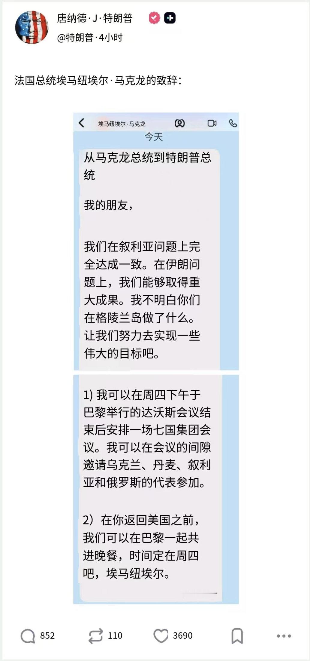 特朗普在社交媒体上晒出法国总统马克龙和北约秘书长马克·吕特给他的信——欧洲的好日