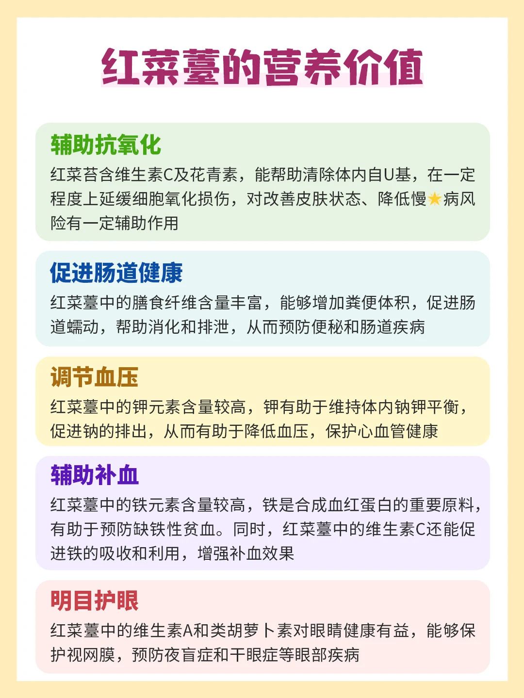 红菜苔含维生素C及花青素,自能帮助清除体内自U基,在一定程度上延缓细胞氧化损伤,对改善皮肤状态、降低慢🌟病风险有一定辅助作用