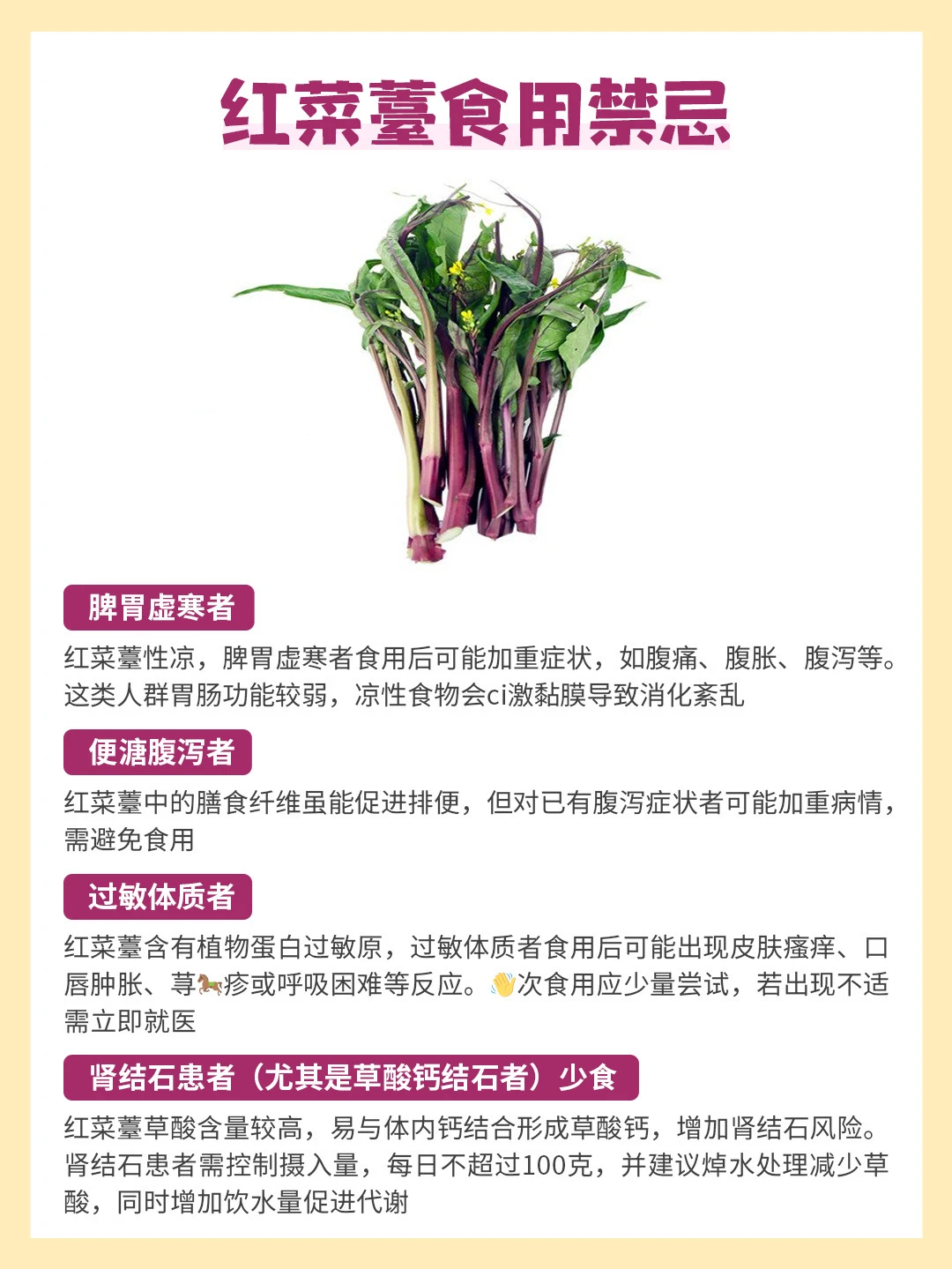 红菜薹性凉,脾胃虚寒者食用后可能加重症状,如腹痛、腹胀、腹泻等。这类人群胃肠功能较弱,凉性食物会ci激黏膜导致消化紊乱
