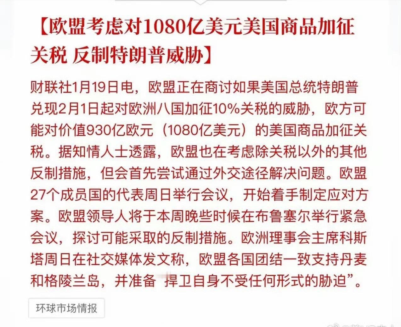 欧洲终于反省了,早就该站起来了 之前就像被美国捏住了命门,一天天的不作为 不过他们对美国也是有所忌惮的,因为他们每个国家基本都有美国的“驻菌”,美其名曰维稳和保护欧洲,也让欧洲各国不敢轻举妄动 不知道这出戏最终结局怎么样,总比以前一天天的俯首称臣、扮演小弟强多了 欧洲反击美国