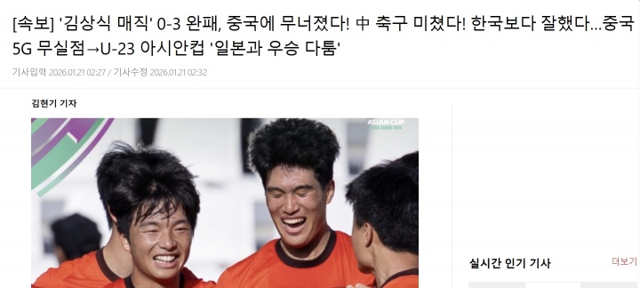 韩媒新闻标题:金相植的魔力在0-3负于中国的比赛中崩塌!中国足球太疯狂了!他们踢得比韩国还好……中国队5场0失球,与日本争夺冠军。