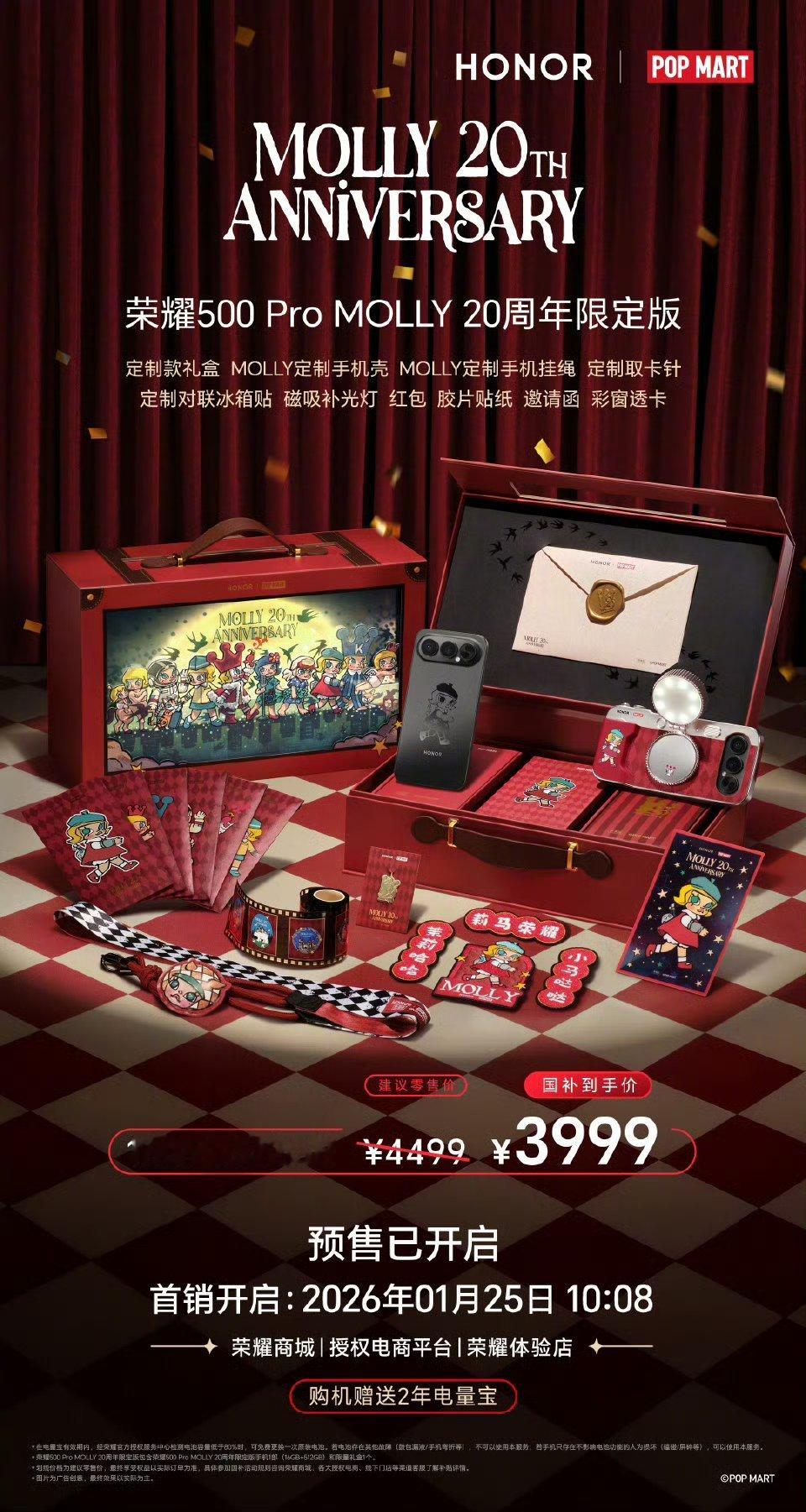 荣耀 500 Pro MOLLY 20 周年限定版售价 4499 元,国补后 3999 元,1 月 25 日 10:08 开售一图读懂荣耀500 Pro MOLLY 20周年限定版礼盒! 四大专属:专属外观、专属配件、专属定制水印、专属定制主题。产品搭载旗舰级影像、续航、芯片,性能BUFF叠满! 荣耀500 Pro MOLLY 20周年限定版礼盒预售已开启!荣耀500泡泡玛特MOLLY