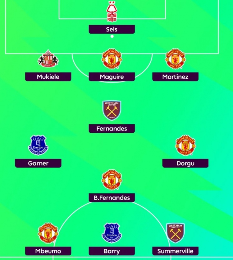 中场:马特乌斯·费尔南德斯(西汉姆联)、詹姆斯·加纳(埃弗顿)、B费(曼联)、多尔古(曼联)