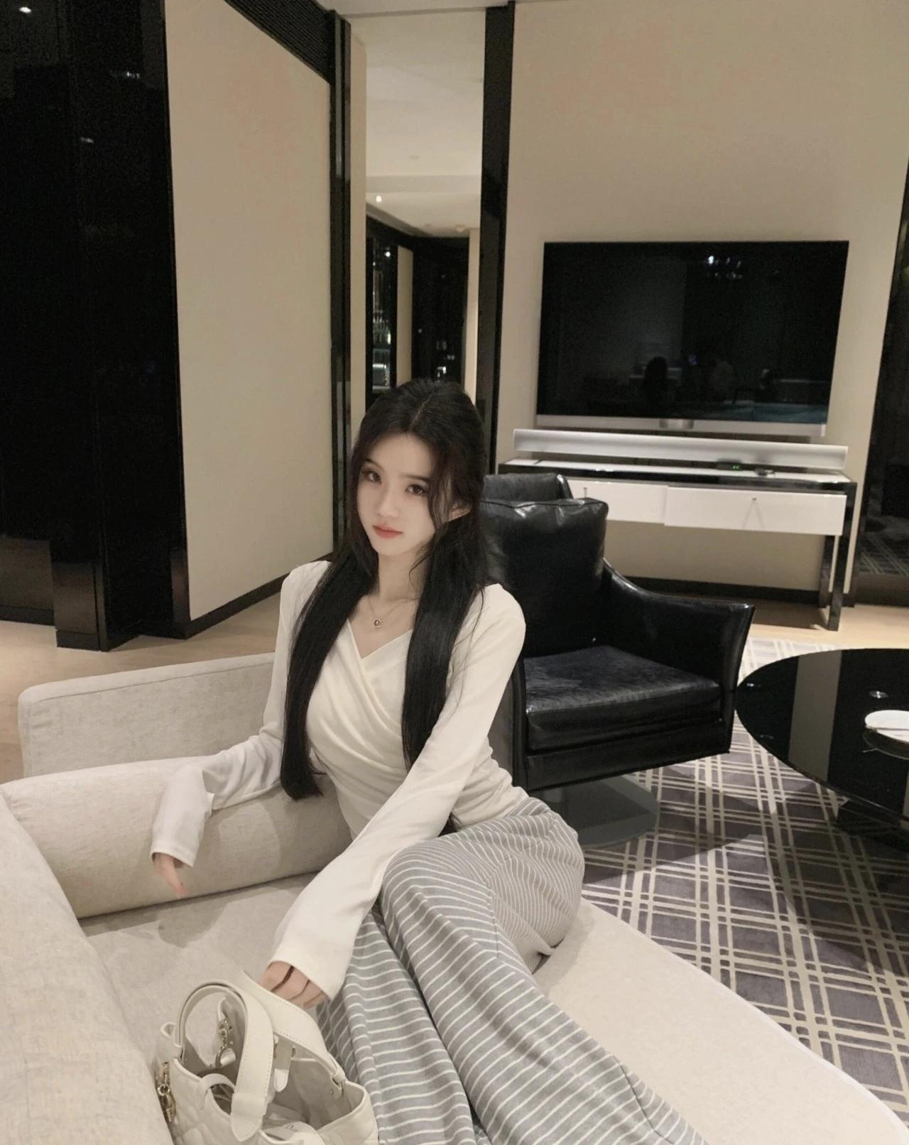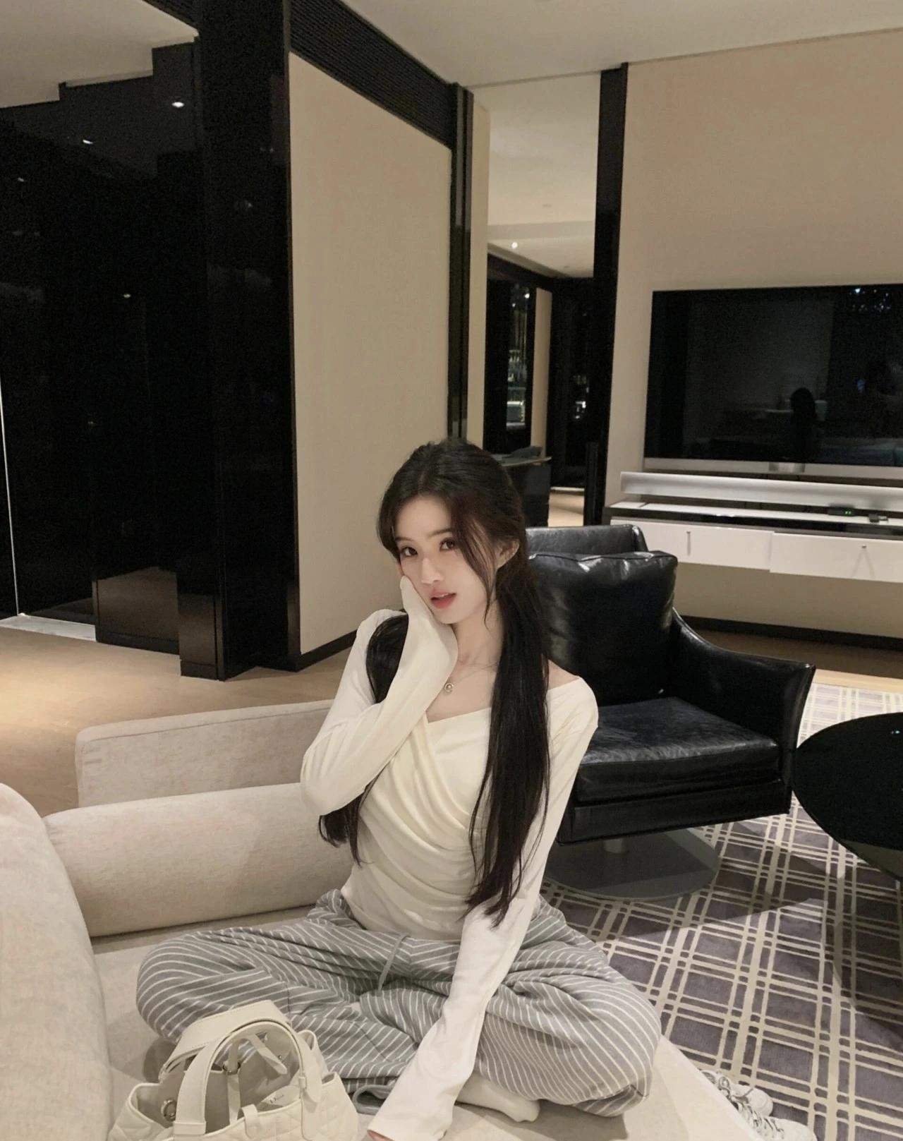 米白上衣配条纹阔腿裤,把舒适和温柔揉进慵懒的宅家时刻。柔和的灯光里,松弛感就是今天的主角。