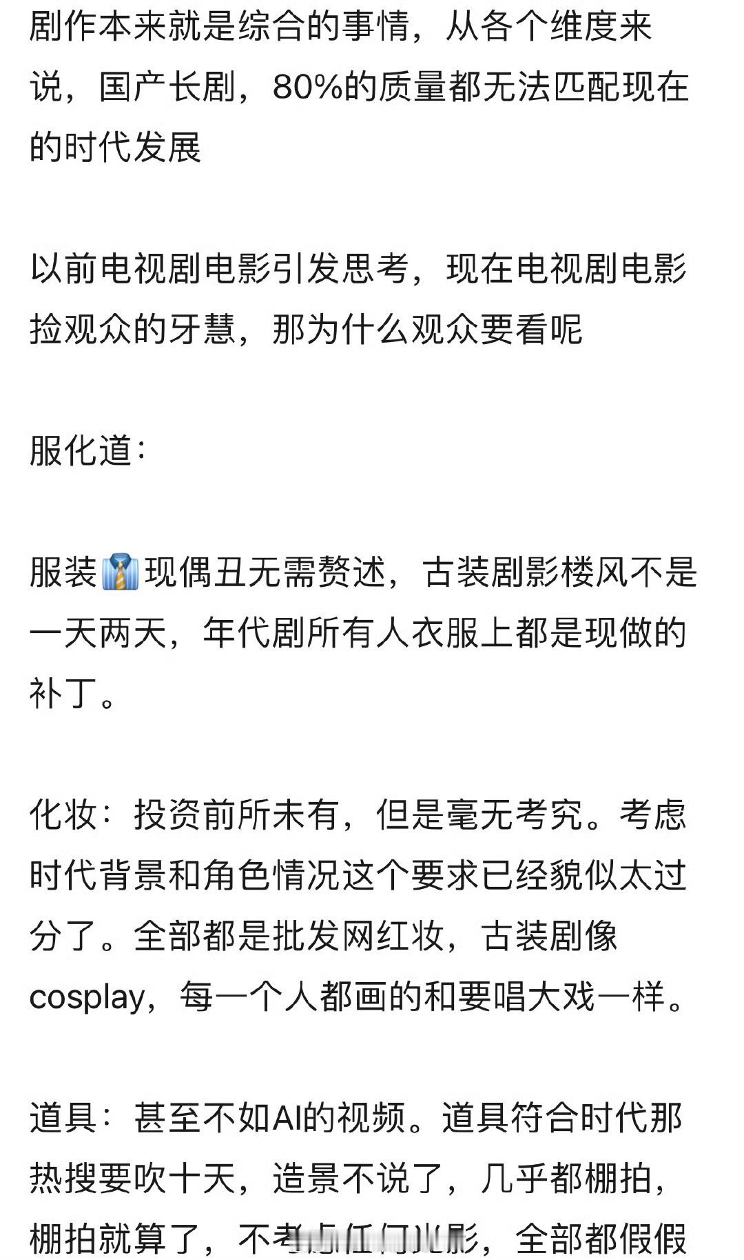 长剧衰落原因本质上是不是观众在进步,影视剧止步不前。服化道做不好,甚至连最基本的