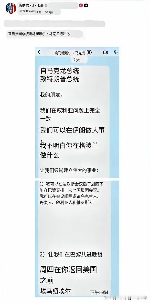 马克龙现在最想干的一件事就是撤回消息啊!特朗普这么不给面子,还记仇,不加入和平委员会就给葡萄酒和香槟加200%关税,还要把短信给全世界看,真的是“我把你放心上,你把我放网上”。 不过,从这条短信里“在伊朗做大事”的表述让人脊背发凉。 结合美法此前推动对伊“快速恢复制裁”,特朗普政府还酝酿军事威慑、网络攻击等手段,不难看出双方正密谋联手施压。伊朗早已放话“对等回应任何挑衅”,军方更是严阵以待。 这场由私信引爆的博弈,俨然让中东成了火药桶。接下来是外交破局还是冲突升级?答案或许藏在美法的下一步动作里。 特朗普能把马克龙的短信晒出来,说明特朗普一点都不装,全是明牌,特朗普敢发出这条短信,可谓是“一箭双雕”,还可以把责任全推给马克龙。因为他昨天就对记者说,马克龙快卸任了,根本不在乎他,所以晒晒短信又如何呢?