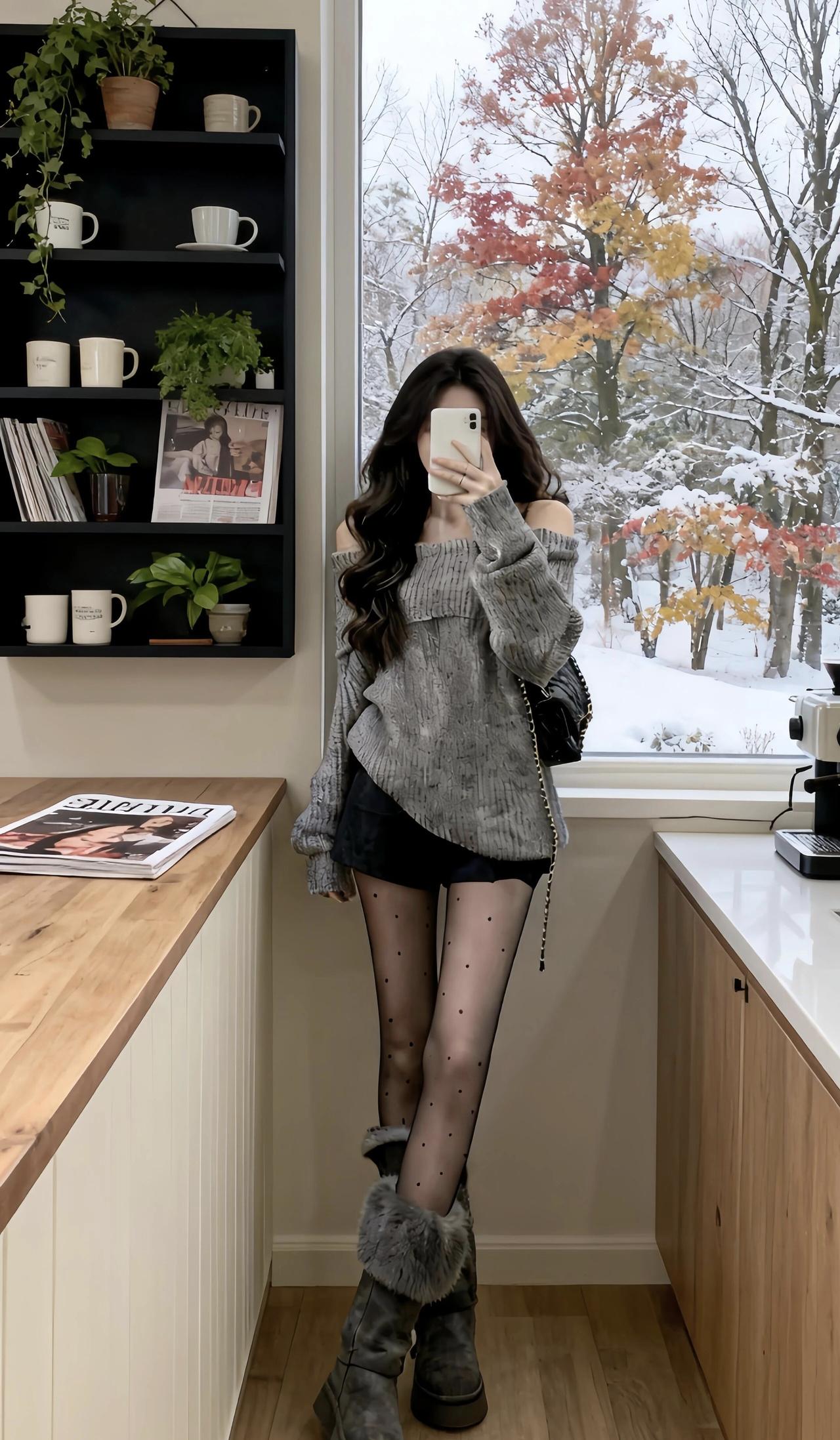 窗外是初雪染过的彩林,室内是暖融融的咖啡香。露肩毛衣配波点黑丝,把冬日的慵懒和甜酷平衡得刚好。