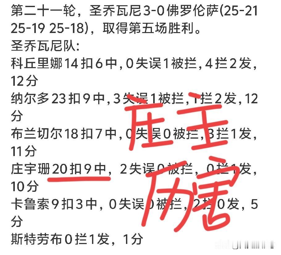 这是一场没有泪水的狂欢[耶] 庄宇珊紧紧地抱着队友,从一点攻到多点开花,从连败到连胜,此刻,她们喊啊,抱啊,跳啊,任心情自由地飞扬。 正是庄宇珊优异的串联,圣乔瓦尼打嗨了,科丘里娜、纳尔多、布兰切尔都得分上双。阿庄接了13个一传,拿了10分,表现很棒。继续为保级加油庄羽珊意甲首秀