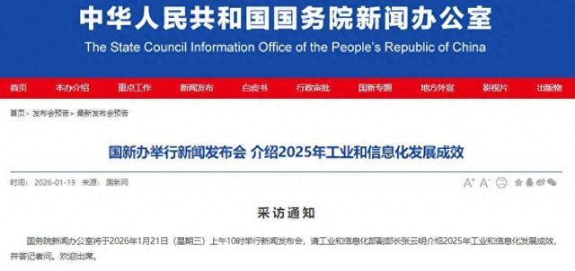 国务院新闻办公室将于2026年1月21日(星期三)上午10时举行新闻发布会,请工业和信息化部副部长张云明介绍2025年工业和信息化发展成效,并答记者问。