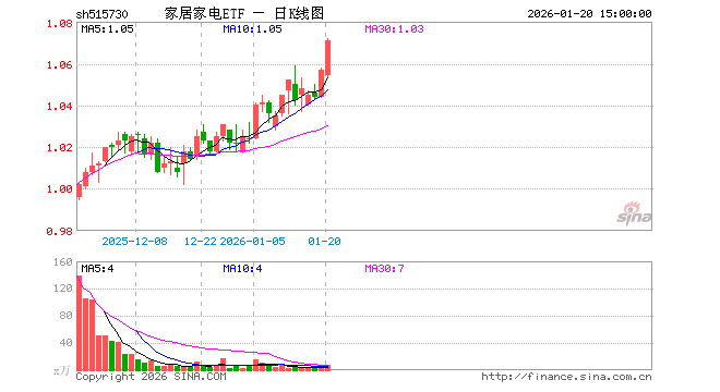 1月20日,家居家电ETF(515730)涨1.32%,成交额726.89万元。当日份额减少100.00万份,最新份额为4589.20万份,近20个交易日份额减少5700.00万份。最新资产净值计算值为4918.25万元。
