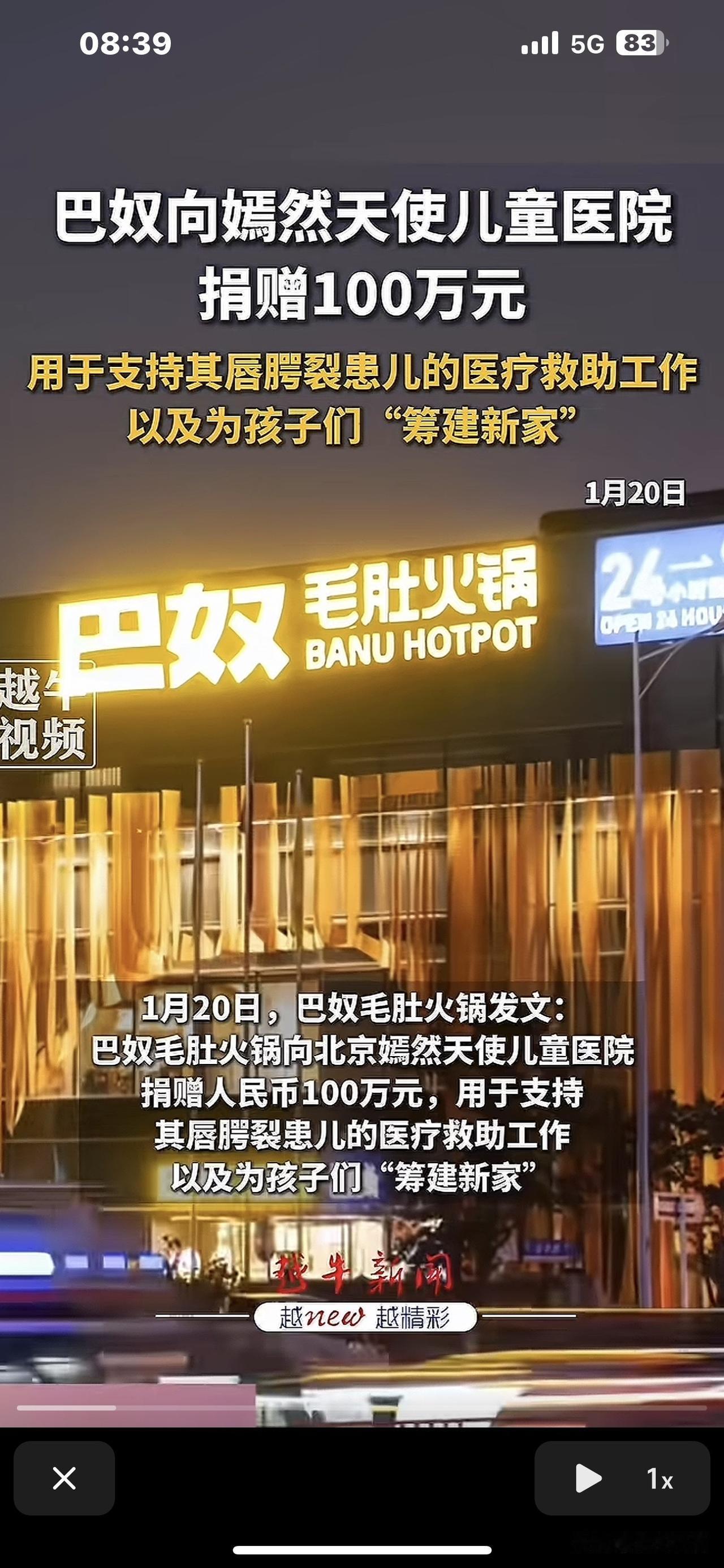 一家火锅连锁店竟向嫣然天使儿童医院捐赠100万元。不得不说,最有格局的企业还得数咱大河南。 1月20日,巴奴毛肚火锅宣布向北京嫣然天使儿童医院捐赠100万人民币,用于支持“唇腭裂儿童”的医疗救助工作,为唇腭裂儿童“筹建新家”。 我查了一下,这家火锅连锁店2001年创立于河南南阳,创始人是杜中兵。 巴奴毛肚目前在全国46座城市拥有162家门店,仅河南省内就有52家。在北京、上海、广州、深圳,以及杭州、宁波、重庆、成都、武汉、南京等准一线城市均设有连锁店。 这样有格局的企业,倾尽全力支持公益事业,要是咱们城市有他们的连锁店,一定要支持一下。 (图片来源网络)