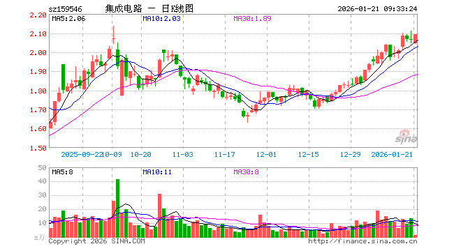 1月21日,集成电路ETF(159546)开盘跌0.87%,报2.046元。集成电路ETF(159546)重仓股方面,中芯国际开盘跌1.02%,寒武纪跌0.57%,海光信息涨3.65%,澜起科技涨0.70%,兆易创新涨1.03%,豪威集团跌0.72%,芯原股份跌1.22%,长电科技跌0.97%,紫光国微跌1.15%,通富微电跌0.02%。