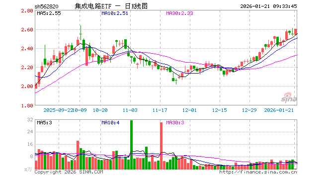 1月21日,集成电路ETF(562820)开盘跌0.47%,报2.535元。集成电路ETF(562820)重仓股方面,寒武纪开盘跌0.57%,中芯国际跌1.02%,海光信息涨3.65%,澜起科技涨0.70%,兆易创新涨1.03%,豪威集团跌0.72%,芯原股份跌1.22%,长电科技跌0.97%,紫光国微跌1.15%,通富微电跌0.02%。