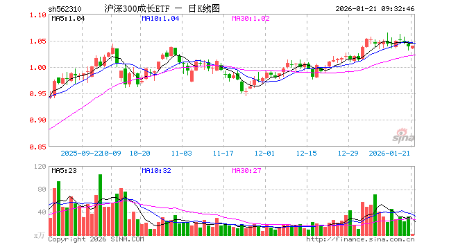 1月21日,沪深300成长ETF(562310)开盘跌0.39%,报1.034元。沪深300成长ETF(562310)重仓股方面,宁德时代开盘涨0.67%,贵州茅台涨0.00%,紫金矿业涨1.21%,新易盛涨0.12%,中际旭创涨0.21%,立讯精密跌1.41%,恒瑞医药涨0.02%,比亚迪跌0.77%,药明康德跌0.46%,五粮液跌0.28%。