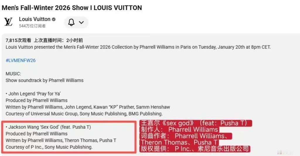 王嘉尔LV大秀放了王嘉尔新歌 顶级音乐邂逅顶级时尚盛宴,与LV创意总监菲董Pharrell、顶级说唱歌手Pusha T联手打造的《Sex God》,在成为巴黎LV大秀秀场专属BGM,作为少数进入顶级时尚与海外音乐市场核心圈层的亚洲艺术家,嘉尔国际时尚影响力再次得到彰显。
