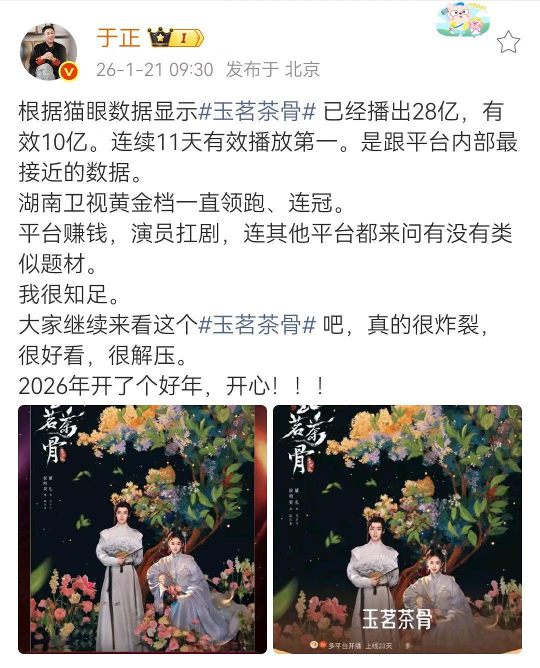 于正说玉茗茶骨领跑、连冠,《玉茗茶骨》连续11天有效播放第一,平台赚钱,演员扛剧,看出来于正对玉茗茶骨的成绩真的很满意了于正说玉茗茶骨领跑于正说玉茗茶骨连冠