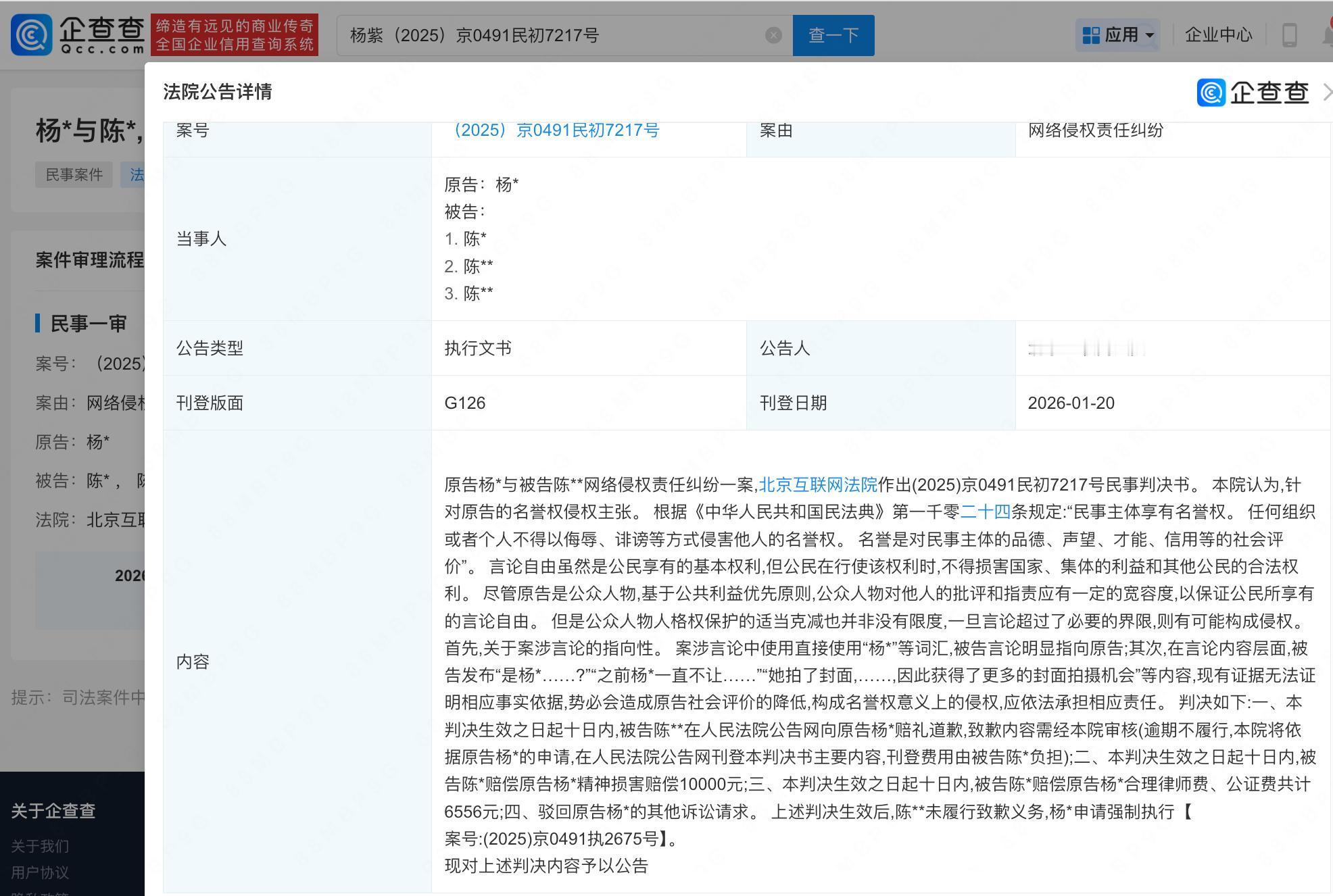 【杨紫告侵权网民获胜申请强执】侵权杨紫网民判赔1.6万 据企查查,近日,北京互联网法院刊登原告杨紫与被告陈某网络侵权责任纠纷一案民事判决书。法院认为,关于案涉言论的指向性。案涉言论中直接使用“杨紫”等词汇,被告言论明显指向原告;在言论内容层面,被告发布的部分内容,现有证据无法证明相应事实依据,势必会造成原告社会评价的降低,构成名誉权意义上的侵权,应依法承担相应责任。判决陈某向原告杨紫公开赔礼道歉,赔偿杨紫精神损害赔偿等合计1.6万余元。上述判决生效后,陈某未履行致歉义务,杨紫申请强制执行。