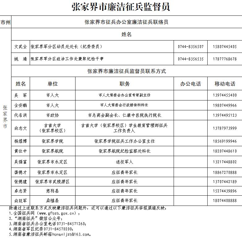 为确保征兵工作公平公正、阳光透明,张家界市人民政府征兵办公室现将2026年度廉洁征兵监督举报渠道公示如下,如出现廉洁征兵问题,请广大群众积极提供线索: