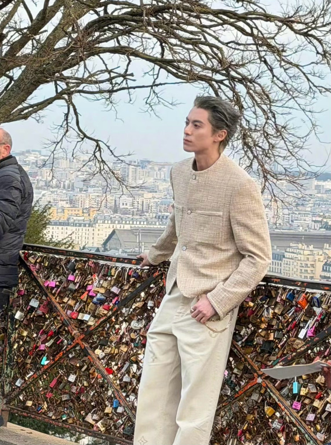 王鹤棣的巴黎时装周妆造图来了,染了一头银发,梳了个大背头发型,这个造型跟王鹤棣的