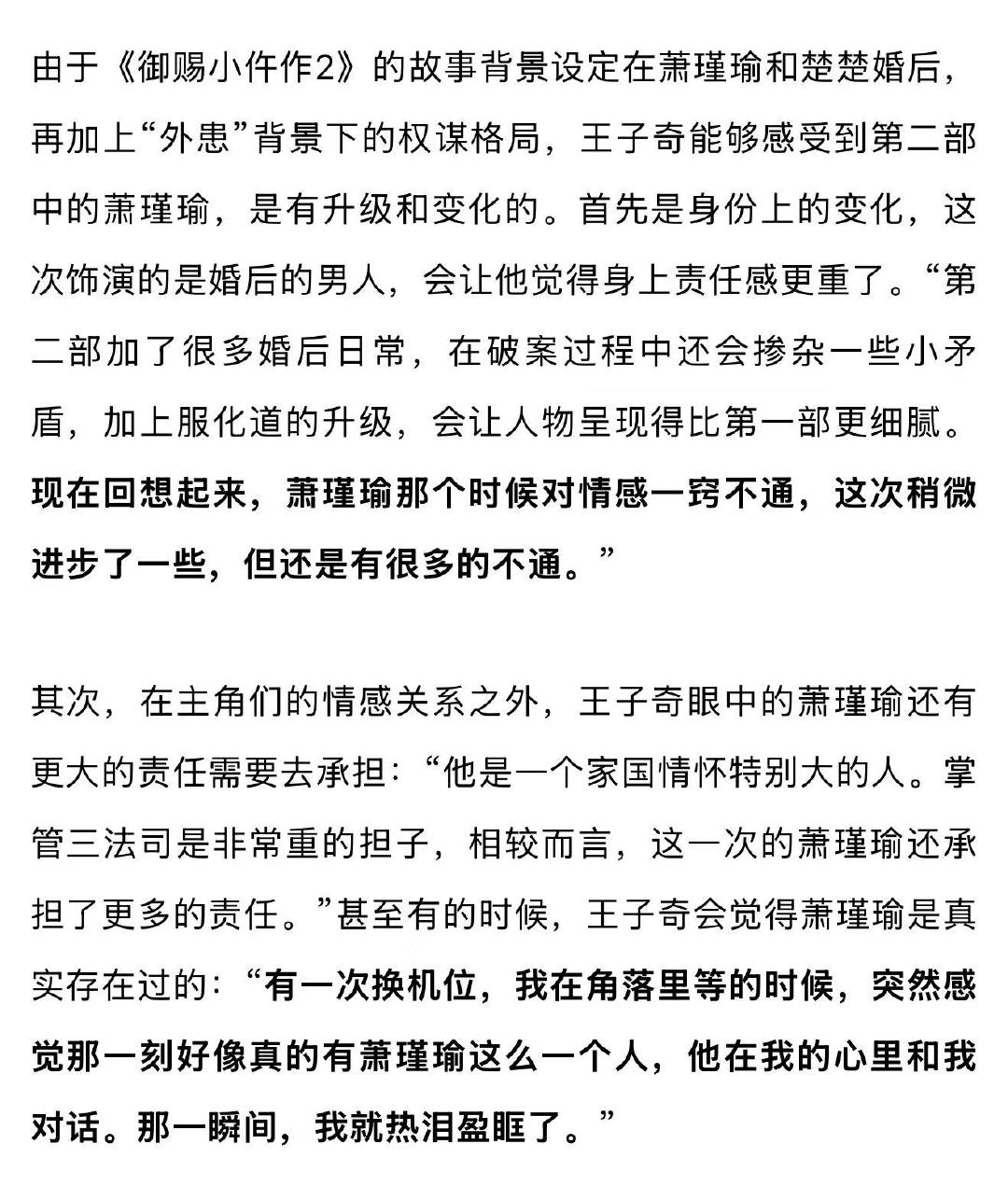 王子奇称萧瑾瑜是人生角色王子奇觉得萧瑾瑜真实存在 在采访中谈到原班人马回归拍摄《御赐小仵作2》,他坦言无法拒绝“这部剧要拍,我就要来演。萧瑾瑜是我的人生角色,我拒绝不了,没有不演的理由。”王子奇眼中的萧瑾瑜有更大的责任需要去承担,甚至有的时候,王子奇会觉得萧瑾瑜是真实存在过的:“有一次换机位,我在角落里等的时候,突然感觉那一刻好像真的有萧瑾瑜这么一个人,他在我的心里和我对话。那一瞬间,我就热泪盈眶了。”