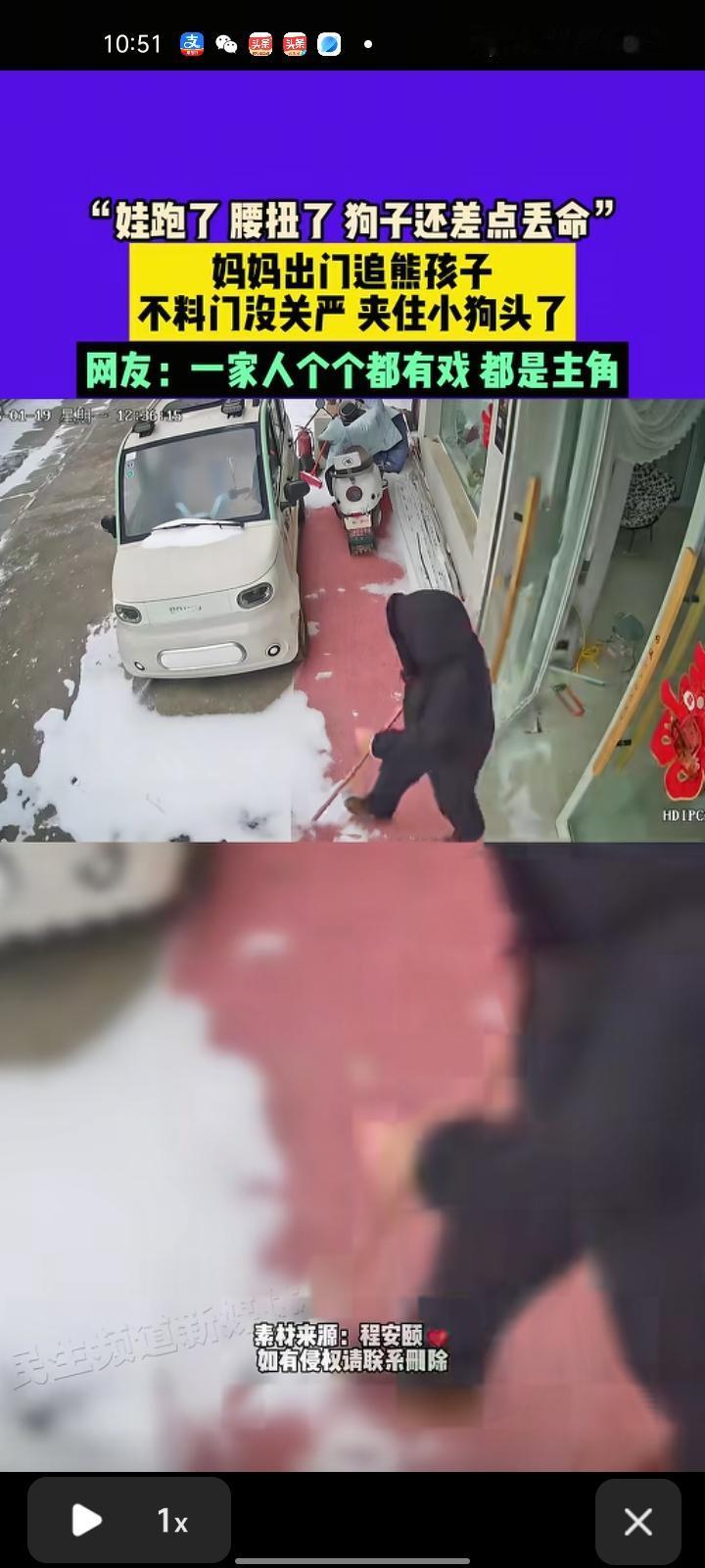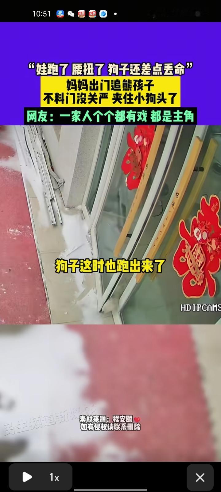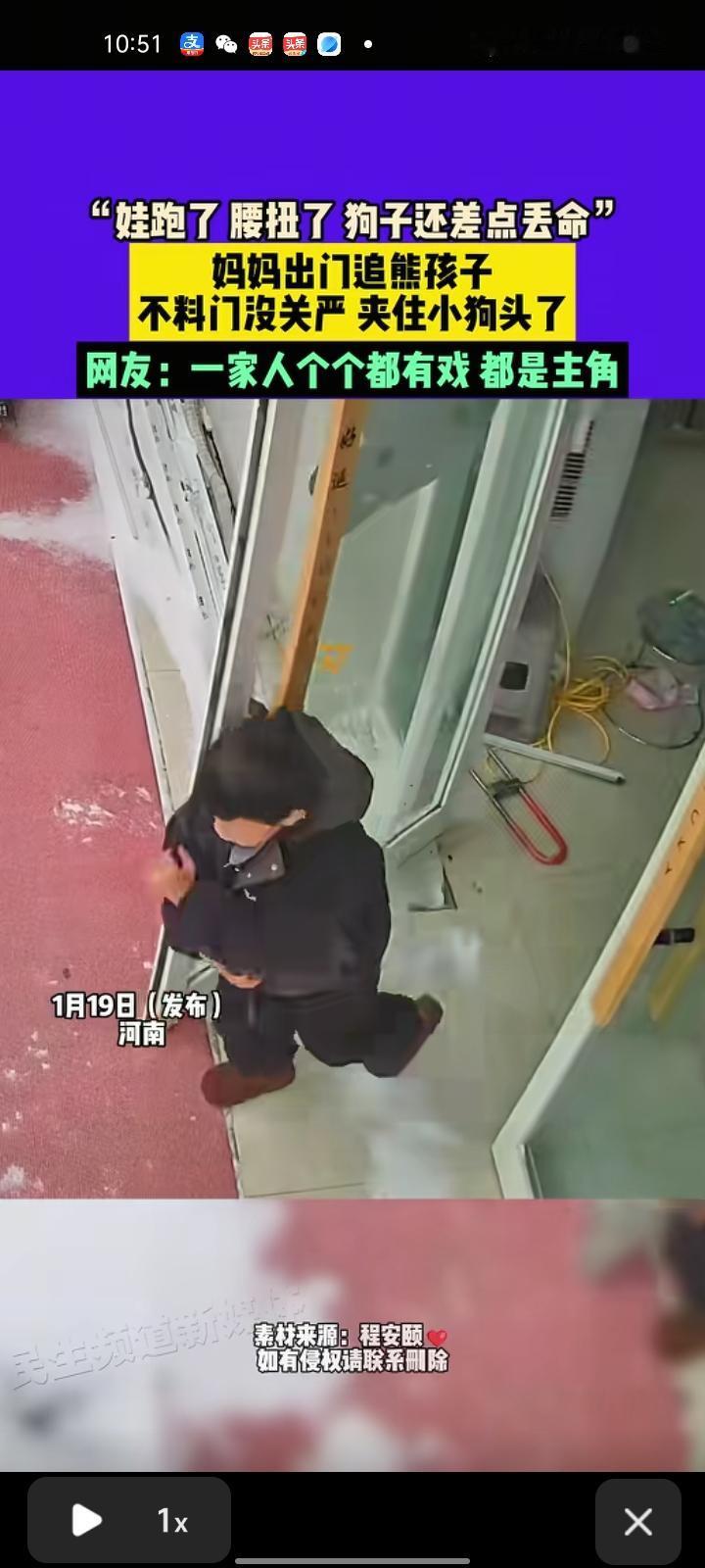 1月19日,周口市商水县。孩子妈妈出门去追熊孩子,狗子也出门,没想到门没关严,夹住了狗头。好在狗子被夹时间不长,再晚来一点可能有生命危险。有网友称,一个犬子无法无天,另一个犬子危在旦夕