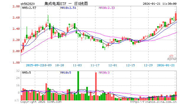 1月21日,截止午间收盘,集成电路ETF(562820)涨4.79%,报2.669元,成交额2416.77万元。集成电路ETF(562820)重仓股方面,寒武纪截止午盘涨2.10%,中芯国际涨3.98%,海光信息涨12.40%,澜起科技涨7.71%,兆易创新涨4.48%,豪威集团涨0.72%,芯原股份涨3.87%,长电科技涨5.19%,紫光国微涨5.31%,通富微电涨10.00%。