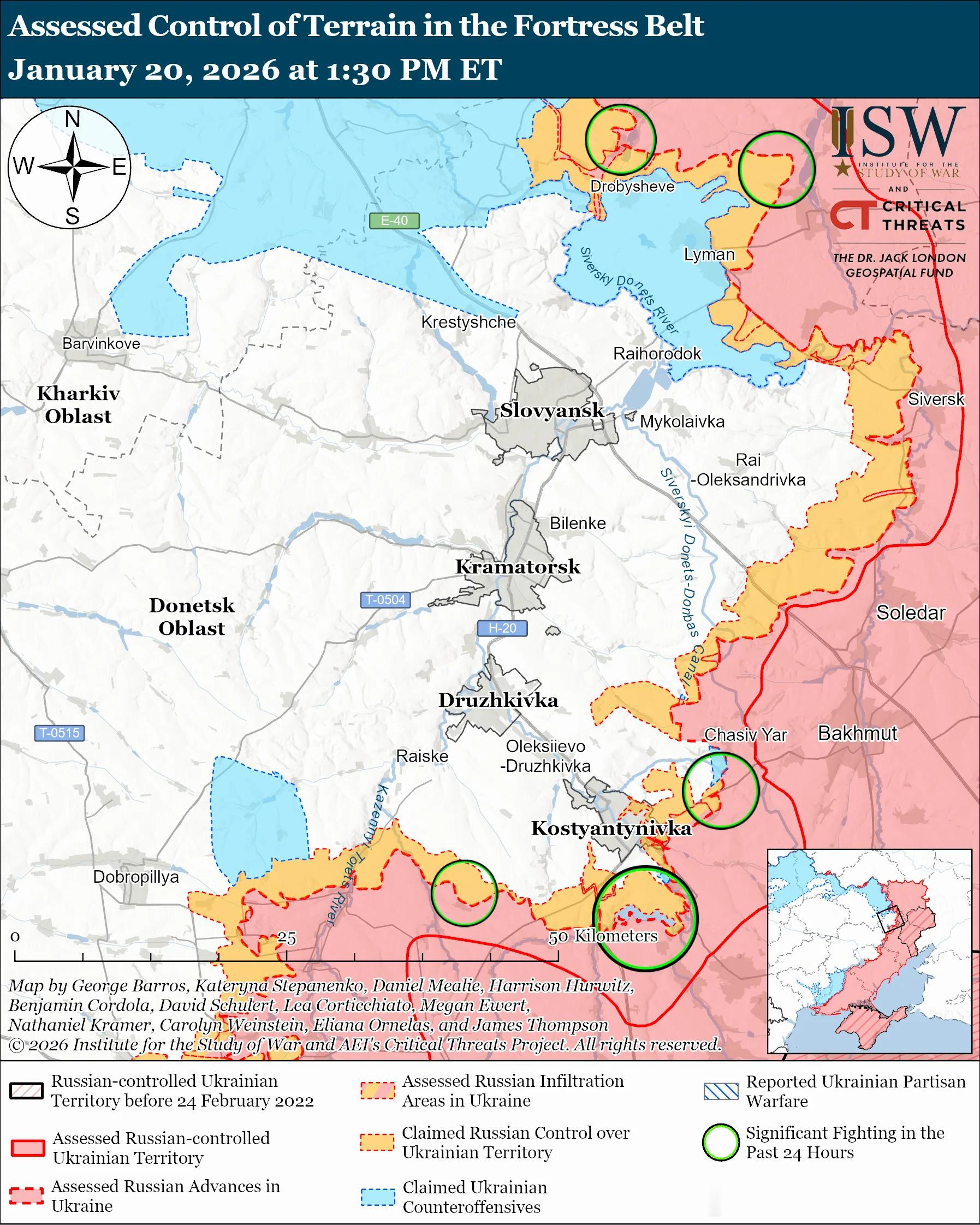 俄军主要行动3——顿涅茨克州俄军目标:占领顿涅茨克州全境,并向第聂伯罗彼得罗夫斯克州推进。1月20日俄军继续向斯拉维扬斯克方向发起进攻,但并未取得进展。1月19日和20日,俄军在莱曼西北部的新谢利夫卡附近、莱曼东北部的科洛迪亚齐和扎里奇内附近、莱曼东南部的迪布罗瓦和奥泽尔内附近、斯拉维扬斯克东北部的德罗尼夫卡和普拉托尼夫卡附近以及斯拉维扬斯克东南部的邦达尔内附近发动了进攻。作战序列:据报道俄第123摩步旅(第3合成集团军[CAA],南部军区[SMD])的无人机操作员和其他部队正在锡韦尔斯克以西地区活动,并袭击向斯拉维扬斯克方向移动的乌克兰运输车辆。第7摩步旅(第3合成集团军[CAA])继续在锡韦尔斯克和扎基特涅(斯拉维扬斯克东北部)附近活动。1月20日,俄军继续在科斯蒂安蒂尼夫卡-德鲁日基夫卡战术区开展进攻行动,但并未取得进展。俄军攻击了科斯特扬季尼夫卡附近;从Kostyantynivka以北前往Pryvillya; Kostyantynivka以东,靠近Predtechyne;位于 Kostyantynivka 东南部,靠近 Pleshchiivka;科斯蒂安提尼夫卡以南,靠近伊万诺皮利亚、谢尔比尼夫卡和克莱班-比克,并向别列斯托克方向; Kostyantynivka 西南部,靠近 Yablunivka 和 Stepanivka;科斯佳提尼夫卡 (Kostyantynivka) 以西,朝向伊利尼夫卡 (Illinivka); Druzhkivka以南,靠近Rusyn Yar;从 Druzhkivka 西南部前往 Sofiivka。一名在科斯蒂安蒂尼夫卡方向作战的乌克兰无人机营军官报告说,俄军正在加大力度在该地区使用无人机伏击,并大量袭击乌克兰的后勤物资。乌克兰顿涅茨克州检察官办公室报告称,1月20日,俄军用6枚FAB-250制导滑翔炸弹袭击了德鲁日基夫卡,造成4名平民受伤。作战序列:俄第4摩步旅(第3集团军)的(FPV)无人机操作员正在伊万诺皮利亚袭击乌克兰军队。第1194摩步团(第4摩步旅)的FPV无人机操作员正在科斯蒂安蒂尼夫卡袭击乌克兰军队。车臣第78北艾哈迈德摩步团(第42摩步师,第58集团军)和 第255摩步团(第20摩步师,第8集团军)正在科斯蒂安蒂尼夫卡袭击乌克兰军队。斯穆格良卡分遣队 和鲁比孔先进无人技术中心的无人机操作员正在 金德拉季夫卡(科斯蒂扬蒂尼夫卡西北部)附近袭击乌克兰军队。第20摩托化步兵师第68侦察营的FPV无人机操作员正在德鲁日基夫卡和 赖斯克(德鲁日基夫卡西南部)附近袭击乌克兰军队。第8集团军第57特种部队连的无人机操作员正在新巴甫洛夫卡、托尔斯克和巴甫洛夫卡(均位于德鲁日基夫卡西南部)附近袭击乌克兰军队。第8集团军第238炮兵旅的无人机操作员正在新戈里霍里夫卡(德鲁日基夫卡西南部)附近袭击乌克兰军队。1月19日和20日,俄军继续在多布罗皮利亚以东的新顿巴斯附近以及多布罗皮利亚东南的托列茨克和扎波维德内附近发动进攻,但没有取得进展。作战序列:据报道俄第 150 摩步师(第 8 集团军)正在多布罗皮利亚战术区作战。俄军最近向波克罗夫斯克方向推进。评估俄军推进情况:1 月 19 日发布的地理定位视频显示,俄军推进至格里申东南部(波克罗夫斯克西北部)。未经证实的说法:一位俄罗斯军事博主声称,俄军向波克罗夫斯克以北和乌达奇涅西北部(波克罗夫斯克西南部)推进。1月19日和20日俄军在波克罗夫斯克附近及城内发动进攻;在波克罗夫斯克以北的比利茨克和罗丁斯克附近发动进攻;在波克罗夫斯克东北部的切尔沃尼(克拉斯尼)莱曼附近发动进攻;在波克罗夫斯克以东的米尔诺赫拉德附近发动进攻;在波克罗夫斯克西南部的科特利涅、乌达奇涅和莫洛杰茨克附近发动进攻;在波克罗夫斯克西北部的格里申附近发动进攻。1月20日,在波克罗夫斯克方向作战的乌军营的一名副指挥官报告说,俄军继续在该旅的责任区内进行持续的渗透行动。这位乌克兰副指挥官评估说,由于地面已经冻得结实,比该地区以前普遍存在的泥泞地面更有利于机械化机动,因此俄军可能很快就会进行机械化突击。一位与克里姆林宫有关联的俄罗斯军事博主承认,乌克兰军队仍然在波克罗夫斯克北部占据有限的阵地。该军事博主声称,俄军正试图在格里申东部郊区站稳脚跟,那里的战斗最为激烈。战斗序列:据报道俄第 56 独立特种部队营的无人机操作员正在比利茨克附近袭击乌克兰军队。鲁比孔先进无人技术中心和维加特种部队分遣队(俄罗斯总参谋部情报总局 [GRU] 第 24 特种部队旅)的无人机操作员继续在波克罗夫斯克方向作战。1月19日和20日,俄军继续在诺沃巴甫利夫卡附近、诺沃巴甫利夫卡东南的霍里霍韦附近以及诺沃巴甫利夫卡以南的达奇涅和菲利亚附近发动进攻,但没有取得进展。1月20日俄军继续在奥列克桑德里夫卡方向发动进攻,但并未取得进展。1月19日和20日,俄军在韦尔博韦和克拉斯诺希尔斯克附近的奥列克桑德里夫卡东南方向发动进攻。