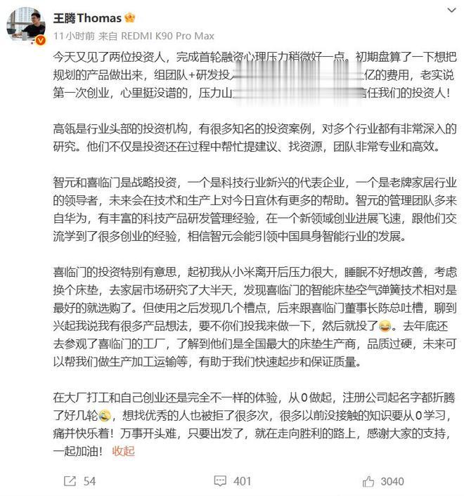王腾发文直言,第一次创业心里完全没底,光组团队、搞研发就得烧几千万甚至上亿,之前在大厂挥斥方遒,如今干啥都得先算钱。这种从0到1的落差,让他在评论区由衷感慨“更理解雷总的勇气和牛逼了”。