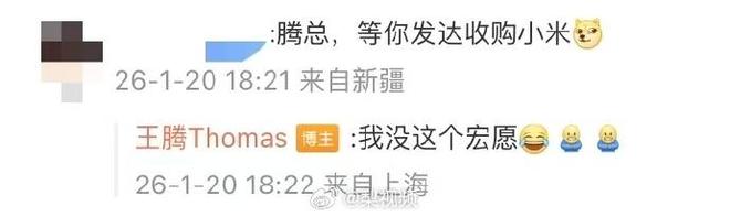 面对“等你发达收购小米”的调侃,王腾直言:“我没这个宏愿[哭笑]。”