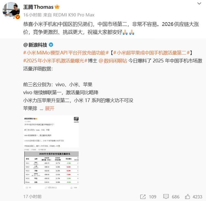 此前,他还曾转发小米手机的市场数据,并写道:“恭喜小米手机和中国区的兄弟们,中国市场第二,非常不容易。”