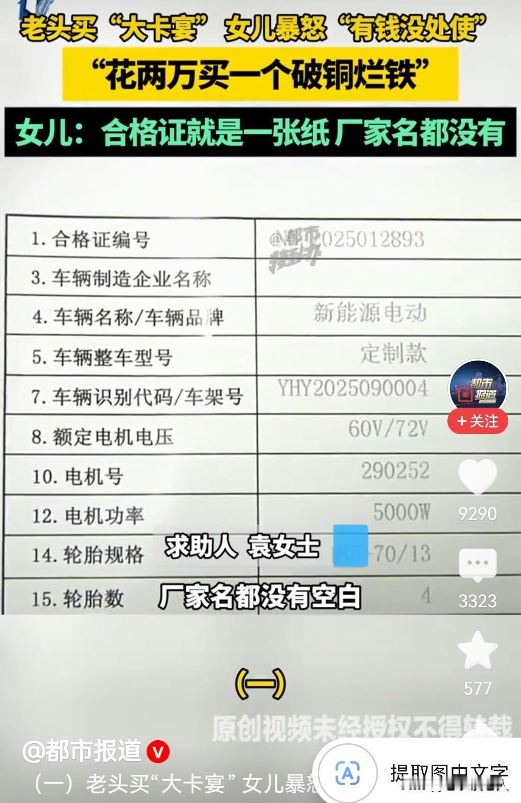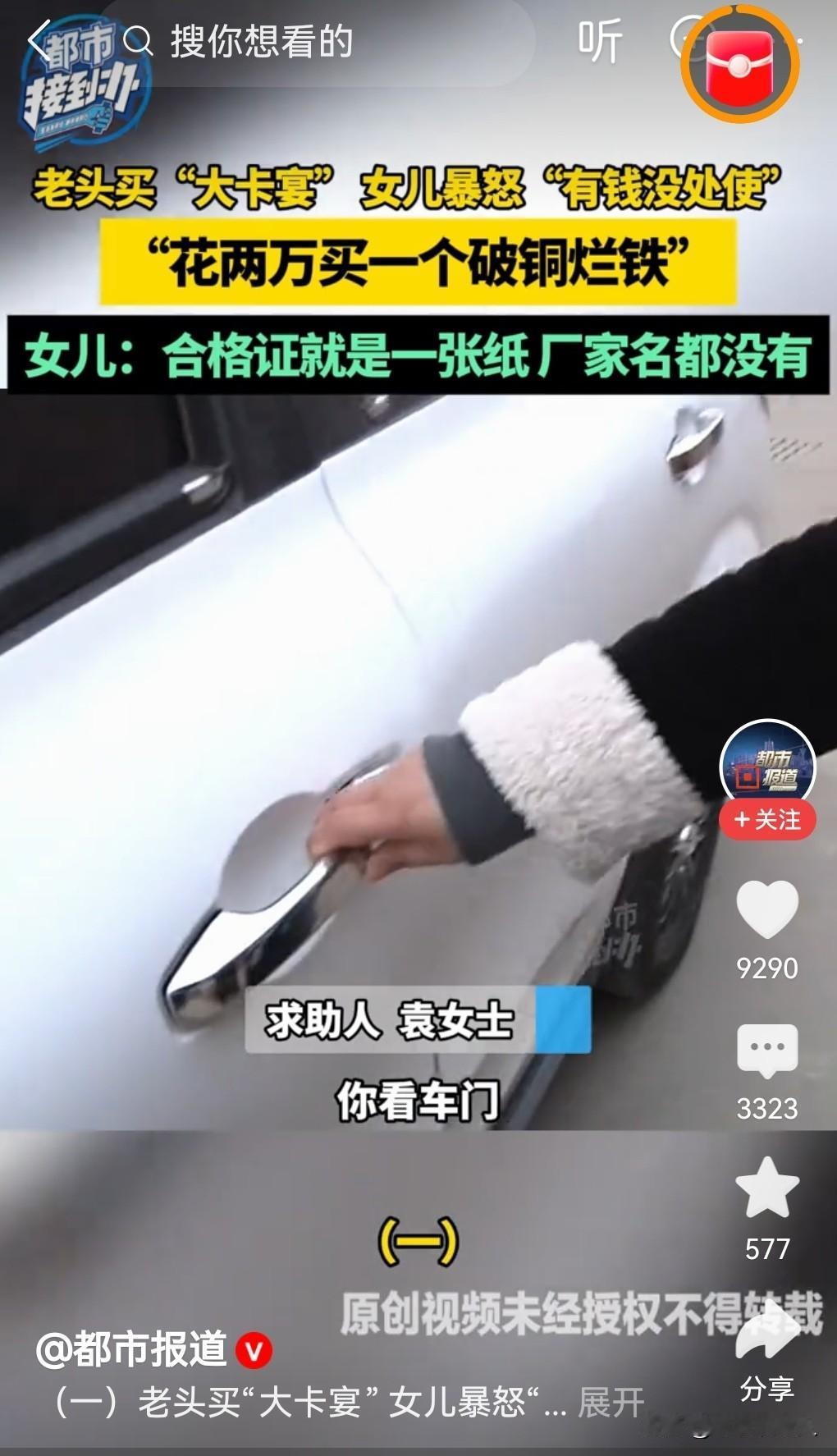 老人花两万买“大卡宴” 女儿暴怒 随着乡村振兴的推进,农村经济的逐步好转,农村四好公路的建设越来越好,农民的经济收入稳步上升,日常生活水平快速提高了,因此,农村老人购车的愿望越来越强烈。 所以很多农村老人买了非常多的便宜的,经济实惠的代步交通工具,如三轮车、电瓶车、老年乐、新能源小汽车等车。 农村老人买车的原则是,买一台经济实惠又耐用的新能源汽车,可以上街买菜,走亲戚等代步之用就足够了,并没有像青年人那样十分考究,要新款,要潮流,要档次,要品质的好车。 但是农村老人由于信息闭塞,不了解汽车市场实际情况,也不懂得汽车的相关知识,导致买车屡屡上当受骗,买到了“杀猪盘”车、“大卡宴”车,买到了“冤大头”车,是经常发生的。 媒体今天报道,河南小袁的父亲花20000元买了一辆外观类似“卡宴”的电动代步车。小袁发现车辆质量低劣,且合格证信息缺失后勃然暴怒,称父亲“有钱没处使”“花两万买破铜烂铁”,并向媒体求助。 透过此事,本人有三种想法,分享给大家,希望对大家有所帮助。 ①车辆的具体问题。建议买车的人都要学习汽车相关的知识,了解实际车辆的具体情况,掌握汽车品质标准,多多了解车辆的性价比,有利于在购买汽车时的选择,避免上当受骗。现在的汽车行业也遵循市场上的行规,一分价钱一分货,价钱贵的,必然汽车的品质要好一些,价钱便宜的,汽车的品质肯定要差一些,是自然的规律。 ②老人购买的动机。老人买汽车的动机就是买一部能够代步的,经济实惠的车辆就足够了,并没有其它方面的考虑。一般老人认为汽车越便宜,购买的成本就低,就会省更多的钱,根本没有考虑到汽车的质量和档次问题,是老人现在买车的权宜之计。 ③仿豪车代步车的行业乱象。现在有很多的商家和汽车小厂家就瞄准了消费者的心理,瞄准了农村老人代步车的火爆市场,又能够赚到更多的利润。因此市场上很多模仿豪车,表面光丽堂皇的,非常艳丽,非常好看吸引人的车辆,但是品质非常低劣,档次很低,都是针对农村老人和经济状况不是很好的消费者而设计的。这些车辆往往都是品质低,冒牌多,三无产品,购车手续残缺,乱象丛生。希望有关部门加强管理。 以上是本人观点,如有不妥,请大家在留言区中留下你宝贵的意见,并积极参与评论。 我的年度菱感记忆老人花两万买“大卡宴” 女儿暴怒