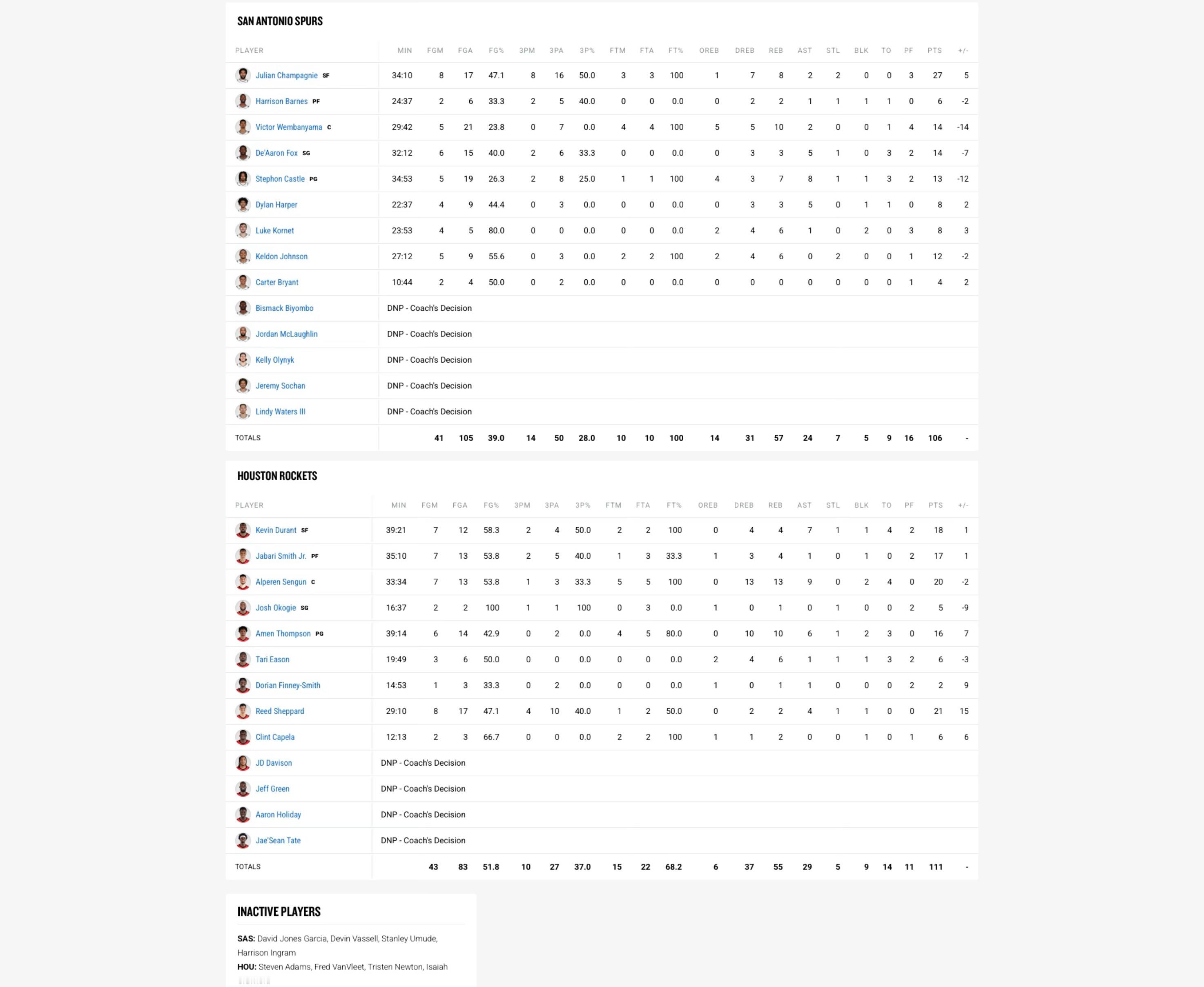 全场比赛结束!马刺106-111被火箭逆转,结束三连胜马刺(30-14):尚帕尼27分8板2助2断、文班亚马14分10板2助、福克斯14分3板5助、卡斯尔13分7板8助、凯尔登12分6板2断、科内特8分6板1助2帽、哈珀8分3板5助、巴恩斯6分2板1助、布莱恩特4分火箭(26-15):谢泼德21分2板4助、申京20分13板9助2帽、杜兰特18分4板7助、史密斯17分4板1助、阿门16分10板6助2帽、伊森6分6板1助、卡佩拉6分2板、奥科吉5分1板、芬尼-史密斯2分1板1助马刺下一场将在1月23日客场挑战爵士超话创作官 |篮球年末狂欢季 |火箭战胜马刺